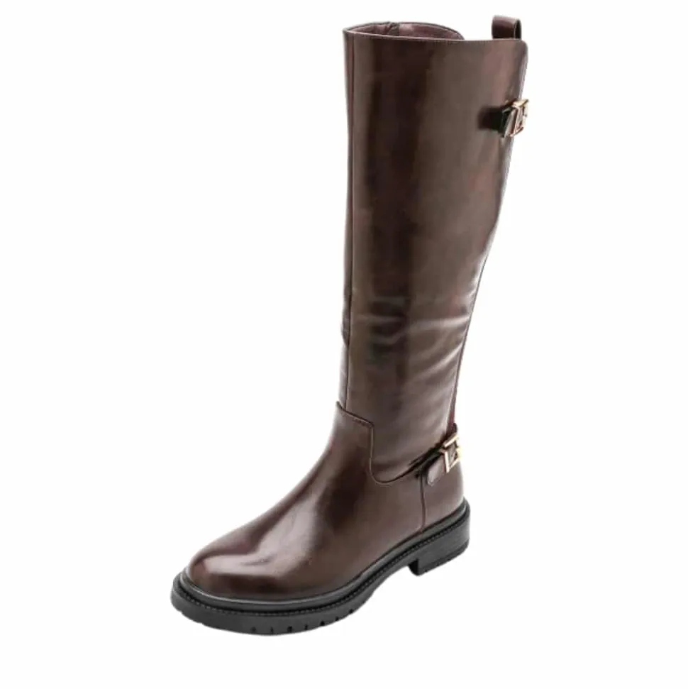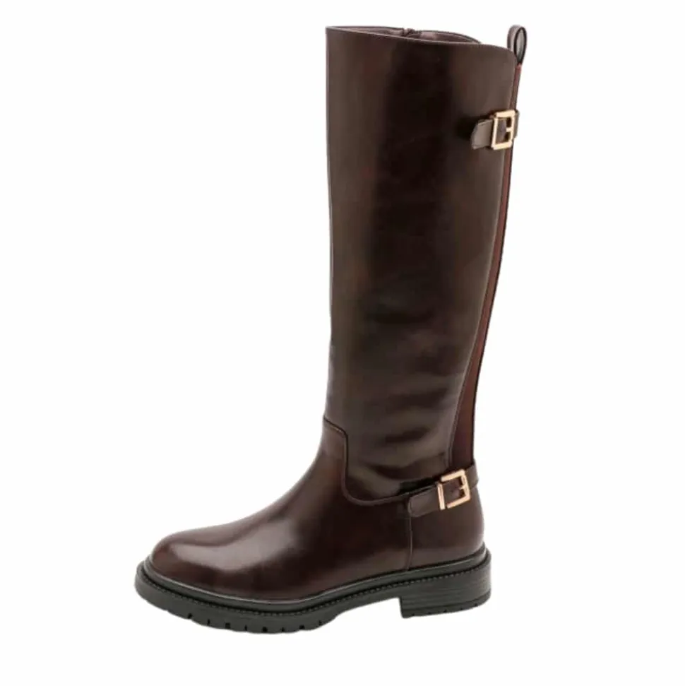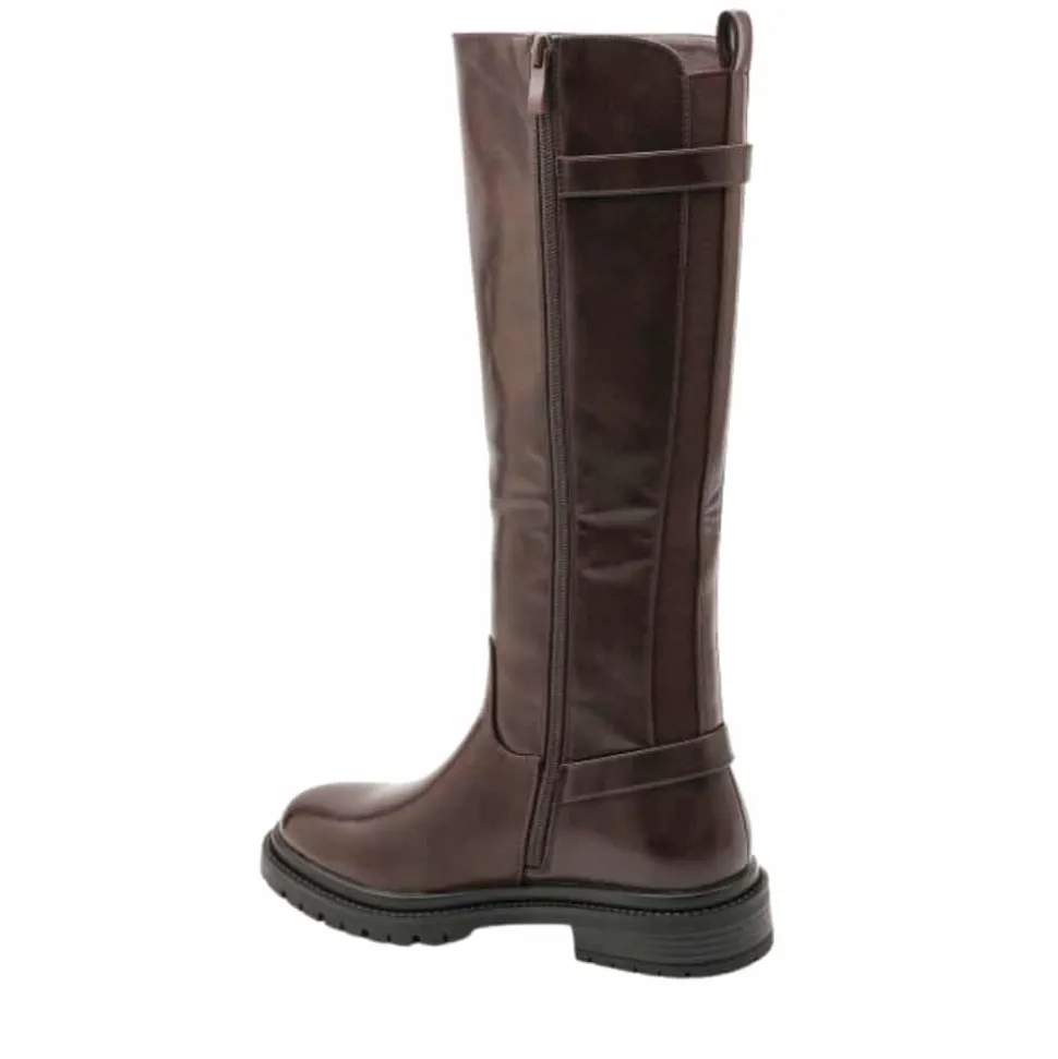 Amour lang støvle til dame i mørkebrun. Klassisk støvle i en smuk mørkebrun farve med et langt skaft og elegante spænde detaljer, der tilfører et moderne udtryk. På indersiden gør en funktionel lynlås det let at tage støvlen af og på, mens elastikken bagpå sikrer en behagelig og fleksibel pasform. Indvendigt giver den bløde indersål komfort dagen igennem, og den chunky ydersål fuldender designet med et stilfuldt og smart look.