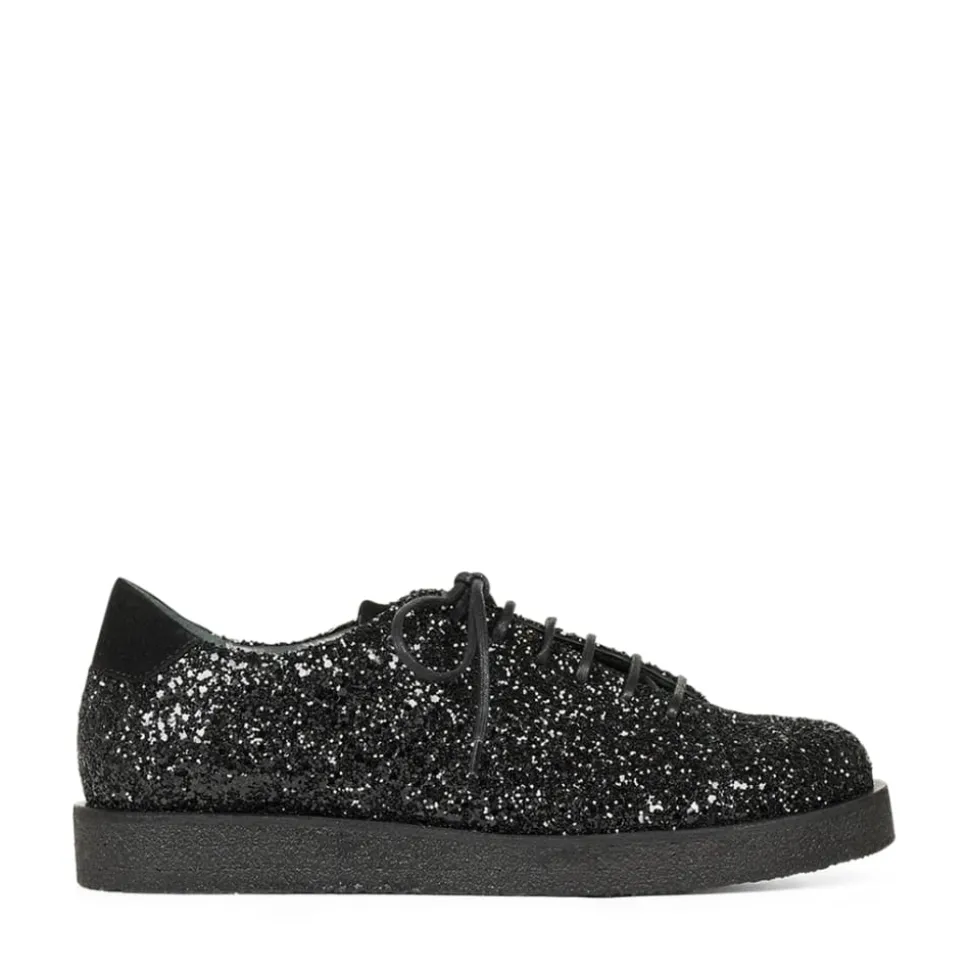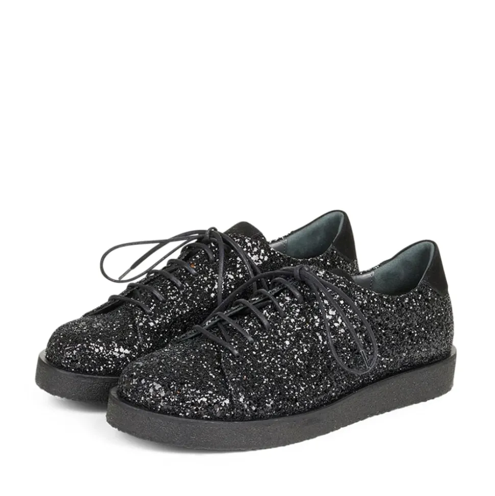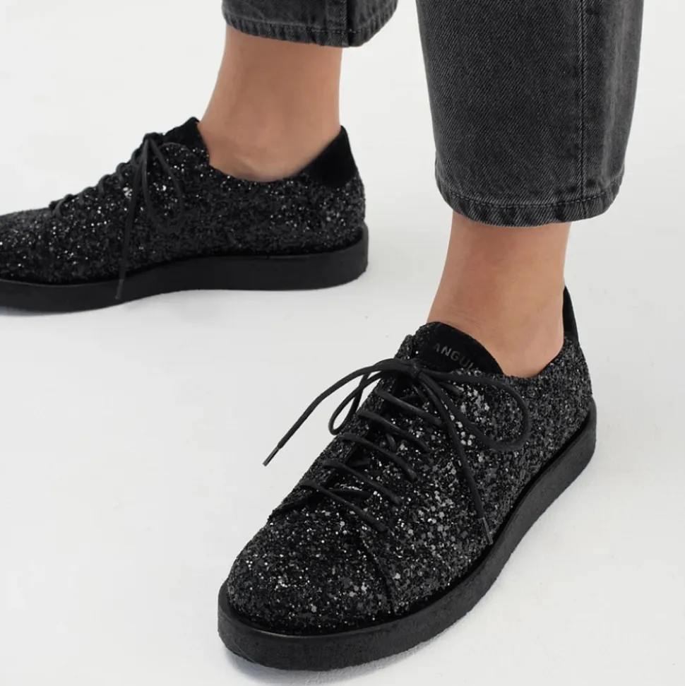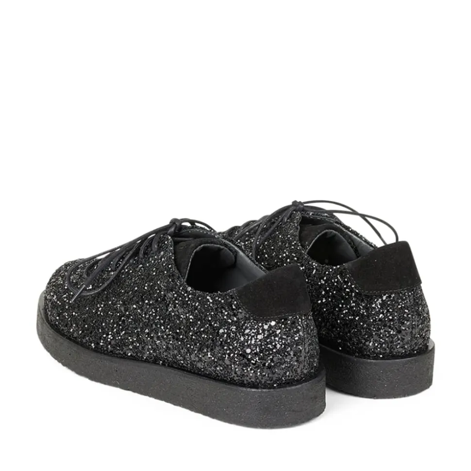 Angulus sko i sort glimmer til dame. Oplev luksuriøse sko af høj kvalitet fra Angulus, der ikke kun tilfredsstiller dine fødder, men også fuldender dit outfit. Disse sko har snørebånd foran og er perfekte til både festlige begivenheder og til at løfte hverdagsstilen. De er konstrueret af førsteklasses materialer og har den velkendte rågummisål fra Angulus, der sikrer både komfort og holdbarhed. Den funklende glitter-sneaker med plateausål har en rund snude, justerbar snørelukning og et ruskindslogo på tungen, der tilføjer en unik detalje. En polstret ruskindskrave giver ekstra komfort og støtte, mens den polstrede indersål og læderforing sikrer en behagelig pasform hele dagen. Skoen er fremstillet af naturligt og åndbart skind med en kanvasbaseret glitterfinish, og den bløde og fleksible rågummisål er lavet af fornybar naturgummi.