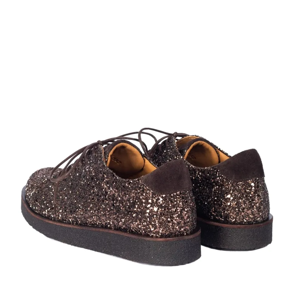 Angulus sko til dame i brun glimmer. Denne glitter og ruskinds sko er skabt med omhu, med fokus på både stil og komfort. Skoen er lavet med en blanding af glitter og ruskind, og er foret med kromfrit skindfoer for at sikre optimal komfort og en sund oplevelse for dine fødder. Den brune rågummisål giver solidt fodfæste og er blød samt fleksibel, lavet af fornybar naturgummi. Designet omfatter en rund snude, justerbar snørelukning og et ruskindslogo på tungen, hvilket tilføjer unik karakter til skoen. En polstret ruskindskrave tilbyder ekstra komfort og støtte, mens den polstrede indersål og læderforing sikrer en behagelig pasform hele dagen. Skoen er håndlavet i Portugal af dygtige håndværkere og designet i Danmark for at tilføje en smule skandinavisk elegance til din garderobe.