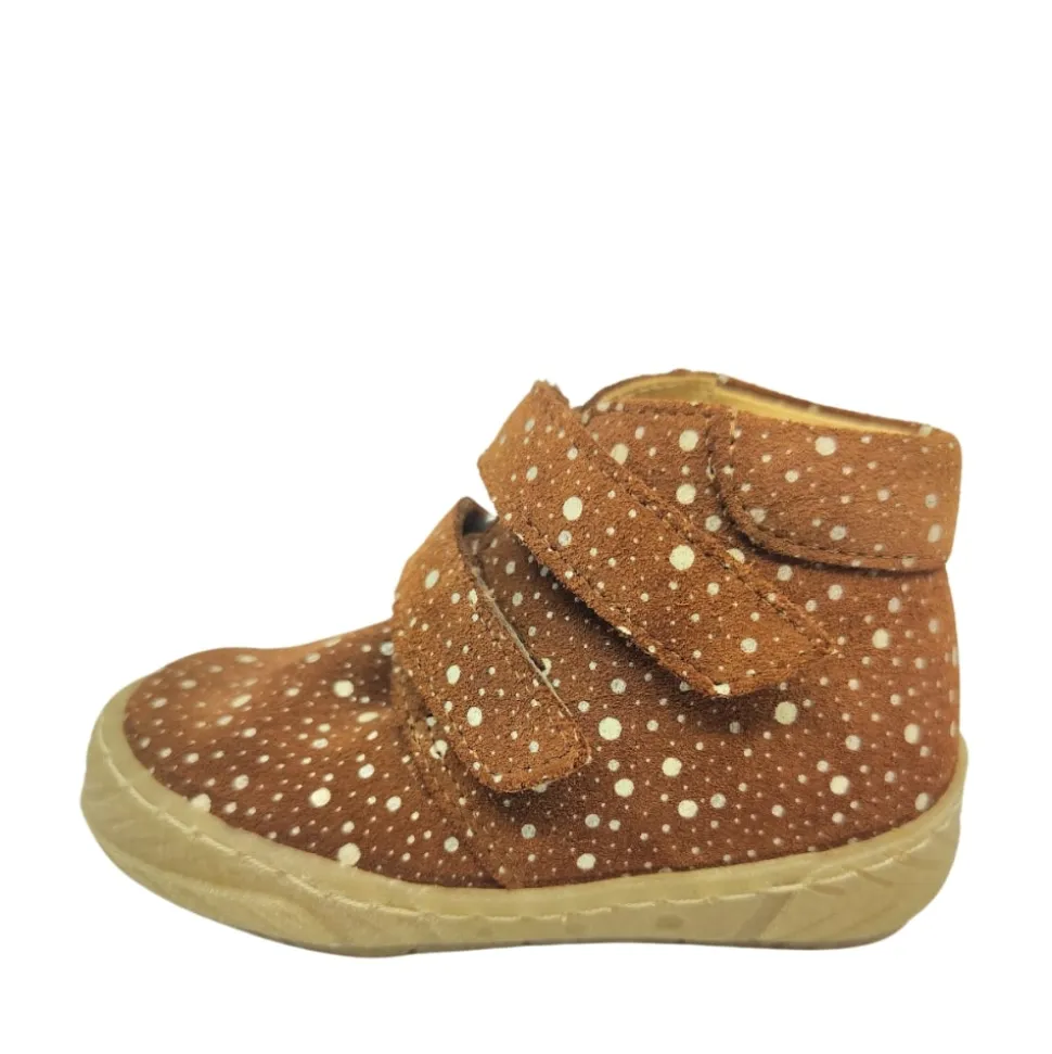 Angulus prewalker støvle til børn i brun med sandfarvede prikker til børn. Blød og fleksibel prewalker lædersko med velcro. Skoen har en rund snude, justerbare velcroremme, vatteret indersål, kromfrit læderfoer, præget logo ved hælen, fast hælkappe med polstret tone-i-tone krave i ruskind for ekstra komfort og støtte og en let, blød og fleksibel gummisål. Udformet i naturligt og åndbart skind. Designet i Danmark og håndlavet med kærlighed i Portugal. Mål altid barnets fod inden du køber, så du får købt den rigtige størrelse. Vi anbefaler et voksetillæg på 1 cm.