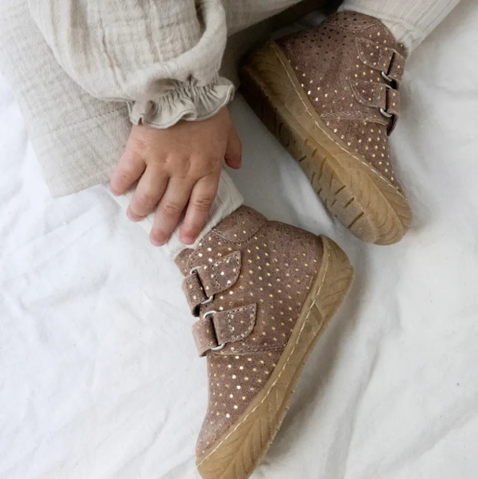 Angulus prewalker støvle til børn i brun med guld prikker til børn. Blød og fleksibel prewalker lædersko med velcro. Skoen har en rund snude, justerbare velcroremme, vatteret indersål, kromfrit læderfoer, præget logo ved hælen, fast hælkappe med polstret tone-i-tone krave i ruskind for ekstra komfort og støtte og en let, blød og fleksibel gummisål. Udformet i naturligt og åndbart skind. Designet i Danmark og håndlavet med kærlighed i Portugal. Mål altid barnets fod inden du køber, så du får købt den rigtige størrelse. Vi anbefaler et voksetillæg på 1 cm.