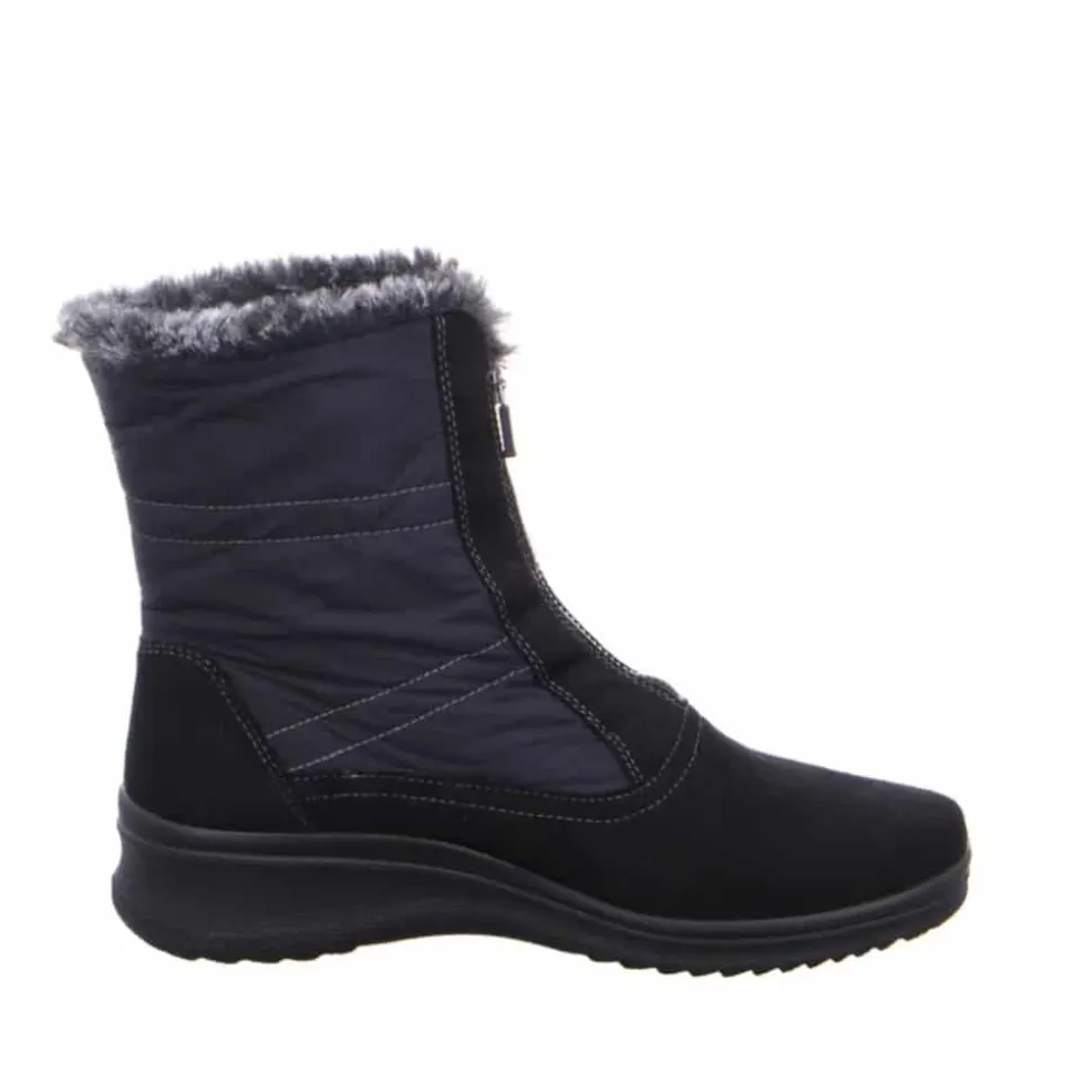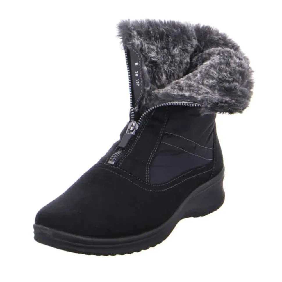Ara vinterstøvle i sort til dame. Denne varmeforede damestøvle fra Ara kombinerer moderne design med stil og komfort. Det bløde, varme for indeni omslutter fødderne behageligt, mens lynlåsen sikrer en tæt pasform omkring foden. Den brede skovidde (H) forhindrer tryk og giver en dejlig følelse, selv efter en hel dag i støvlerne. Den fleksible gummisål sikrer optimal komfort ved hvert skridt. Med sin Gore-Tex-membran er støvlen både vandtæt og åndbar, så fødderne holdes tørre og komfortable i al slags vejr. Med denne varmeforede støvlet fra ara er du sikret høj komfort og en stilfuld dag på farten.
