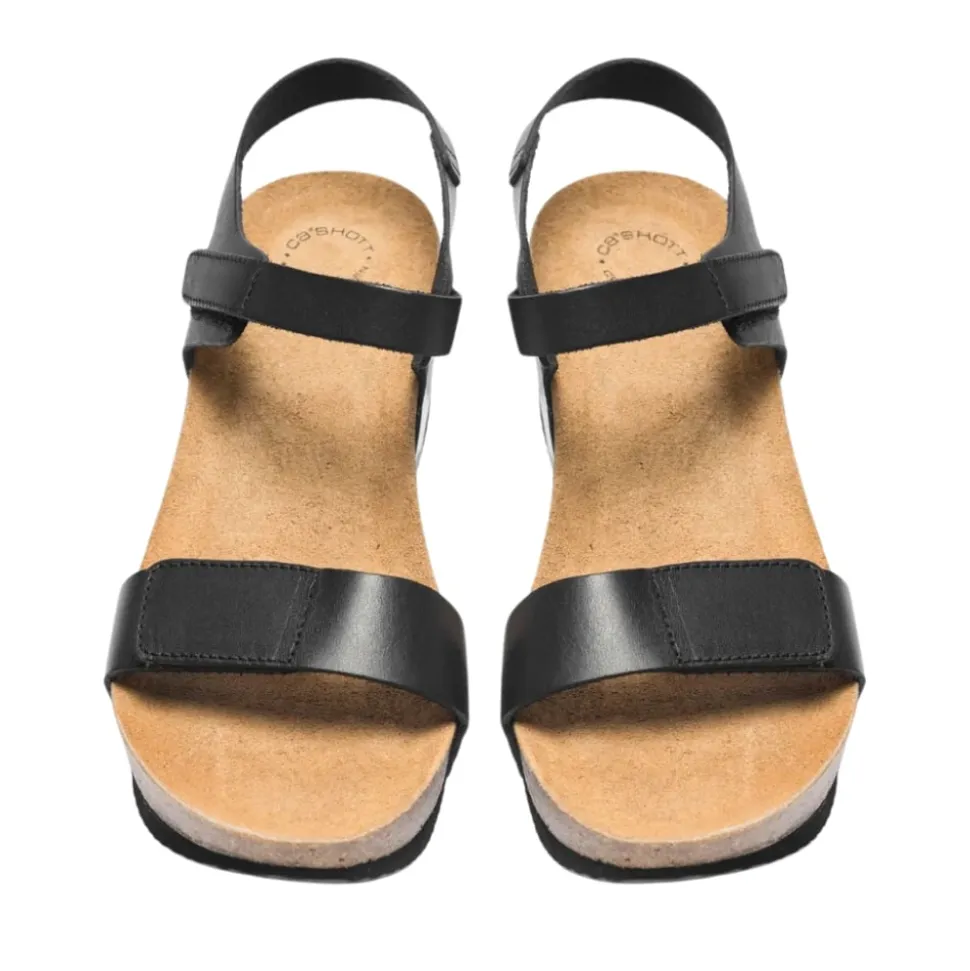 Cashott Casanni sandal til dame i sort. Sandal med kort kilehæl, skabt til mode- og komfortbevidste kvinder. Denne elegante sandal med ca. 6 cm. hæl kombinerer stil med ekstraordinær støtte takket være dens innovative funktioner. Med en letvægts EVA-ydersål og en blød kork- og latexsål former den sig efter din fod for en behagelig gang hele dagen. Hælstroppen tilføjer ekstra stabilitet, mens skindet fra LWG-certificerede garverier sikrer både luksus og bæredygtighed. Justerbare velcrobånd giver den perfekte pasform, og hver sandal er håndlavet i Spanien af dygtige håndværkere.