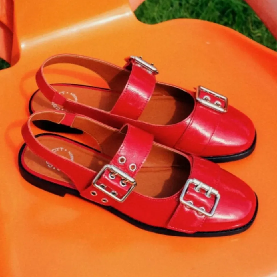 Cashott Casdiana Mary Jane ballerinasko til dame i rød. Denne røde ballerinasko forener elegance og komfort på perfekt vis. Den er fremstillet af 100% blødt patentlæder, som sikrer en behagelig pasform hele dagen. Den blanke lakoverflade og de trendy, justerbare sølvspænder giver et moderne og råt udtryk, der nemt kan styles til ethvert outfit. Skoen er designet med en gummisål og en diskret 1,5 cm hæl, der giver let støtte uden at gå på kompromis med komforten. Indvendigt sørger en åndbar og miljøvenlig mikroforing for et sundt fodklima. Med sin runde snude og skinnende røde patentlæder er denne ballerina både stilfuld og praktisk – et must-have i garderoben.