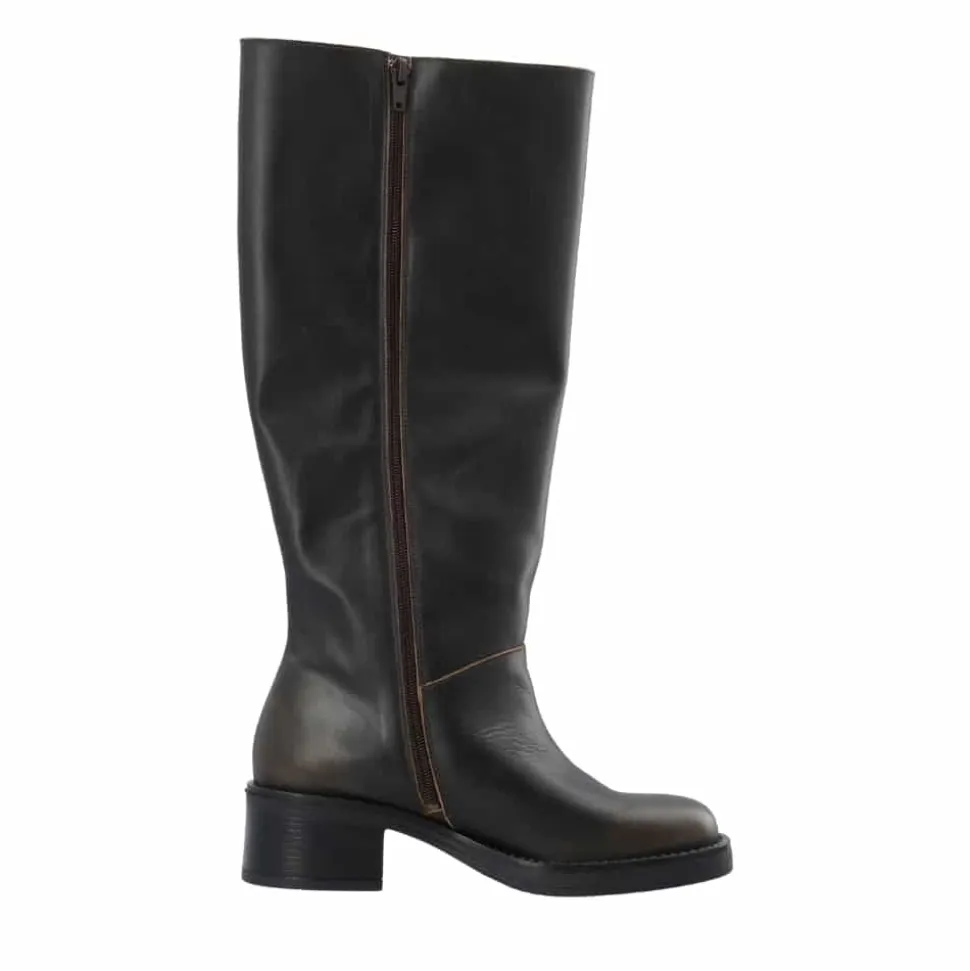 Cashott Casrikke Wide Pull lang støvle til dame i mørkebrun. Elegant støvle i mørkebrun med et elegant og moderne udtryk. Den teksturerede skindoverdel kombineres med en praktisk lynlås på indersiden, så støvlen er nem at tage af og på. Øverst på skaftet giver en justerbar spænde mulighed for en pasform, der sidder perfekt. Indvendigt er der en blød indersål, og den solide blokhæl på omkring 5 cm giver et smukt og komfortabelt løft.