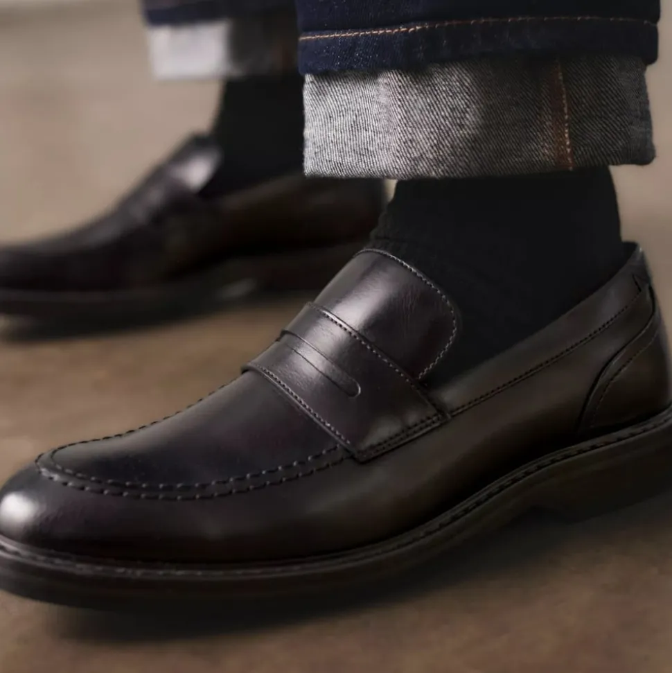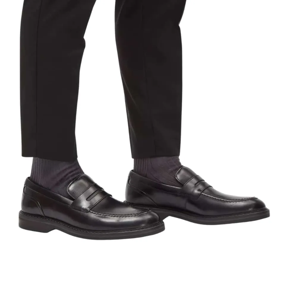 Clarks Aldwin Step loafers til herre i sort. Moderne loafers til herre i sort læder med markerede syninger der giver et stilfuldt look. Skoen er let at komme i og af samt udstyret med en blød indersål der er lavet af skind for optimal komfort. Skoen har en solid ydersål med et godt mønster for øget støtte og skridsikkerhed.