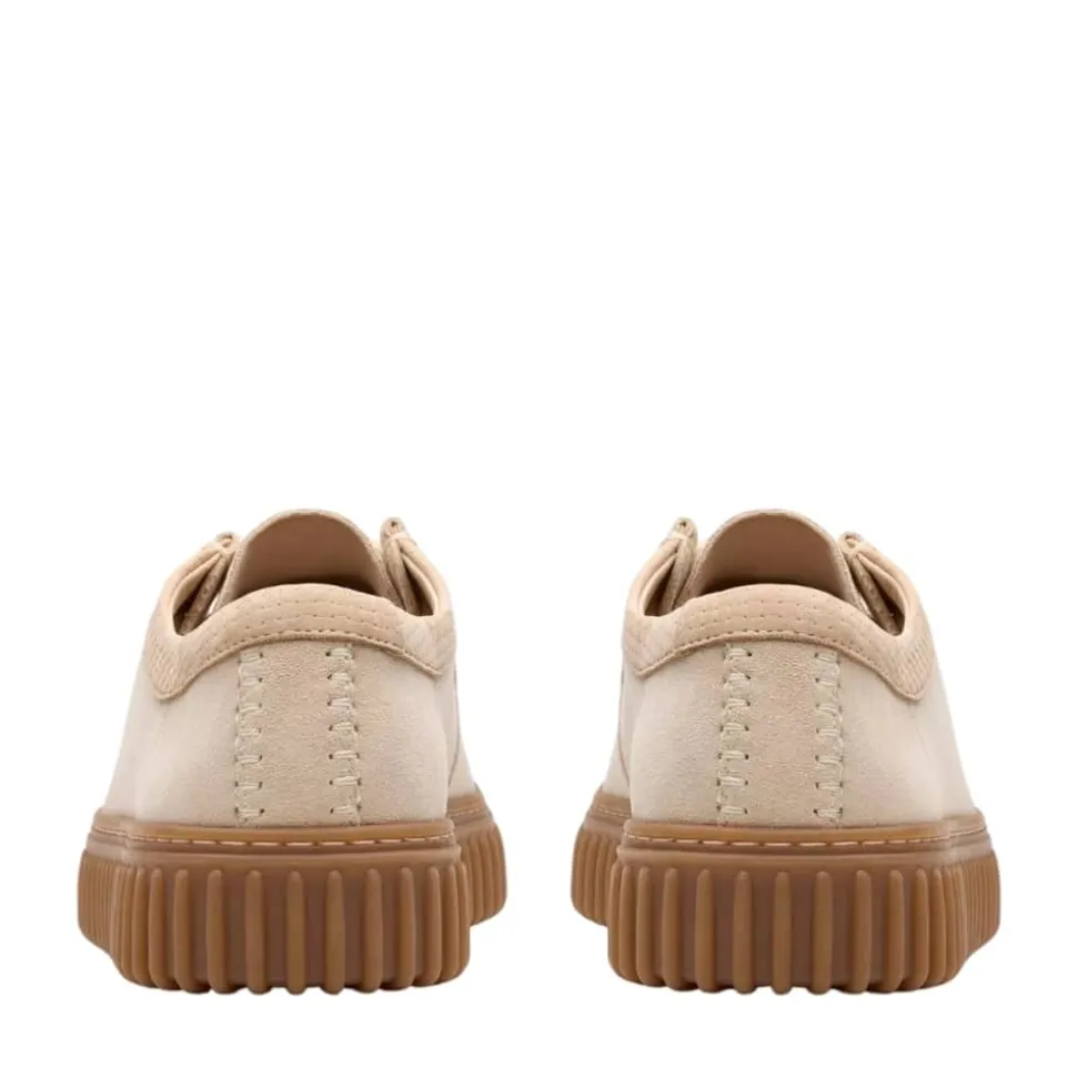 Clarks Torhill Lo sko til herre i beige. Moderne herresko i en flot beige farve med ruskindsoverflade og glatte skinddetaljer indvendigt for ekstra komfort. Skoen har en blød, udtagelig indersål med støttepuder ved både hæl og forfod, som sikrer en behagelig følelse hele dagen. Snørebånd foran gør det nemt at justere pasformen, mens den chunky gummisål og runde snude med markante syninger giver skoen et stilfuldt udtryk.