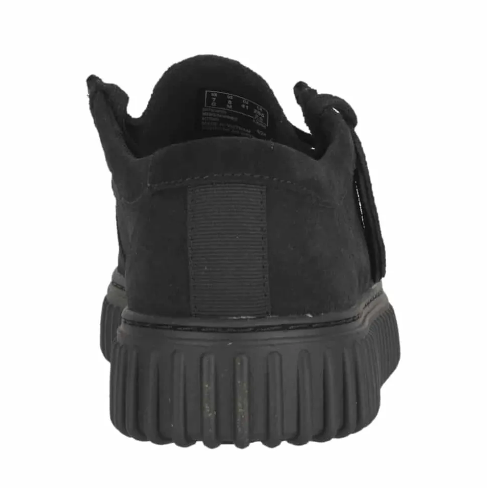 Clarks Torhill Lo sko til herre i sort. Populær herresko i en moderne sort farve med et stilfuldt twist. Skoens ydre er fremstillet af ruskind, mesn det indvendige er beklædt med dele af glatskind, som sikrer en behagelig oplevelse. Den bløde indersål er designet med puder ved trædepuden og hælen for maksimal komfort. Skoen har justerbare snørebånd, så den kan tilpasses dine behov. Den chunky sorte gummisål og den runde snude med markante syninger tilføjer et unikt og stilfuldt udtryk. Derudover er skoen udstyret med en praktisk udtagelig indersål.