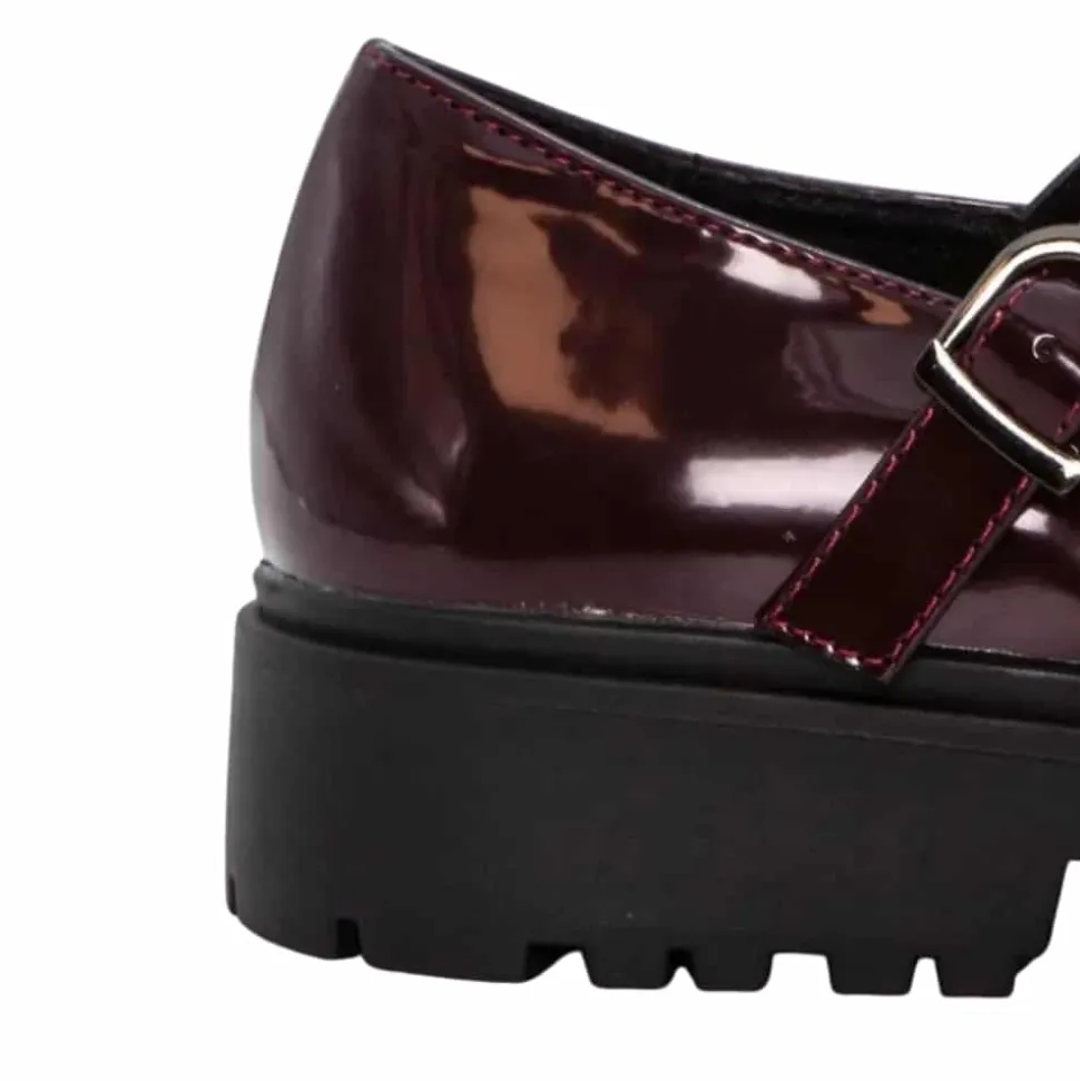Duffy Lattarico Cinque Mary Jane sko til dame i bordeaux lak. Flot sko i bordeaux med en blank lakoverdel, der skaber et elegant og klassisk udtryk. Over vristen finder du en rem med spænde, der let kan justeres, så skoen sidder perfekt. Den bløde sål indvendigt giver en behagelig komfort, mens ydersålen med mønster og en højde på ca. 4 cm giver et smukt løft og gør skoen komfortabel at bruge dagen igennem