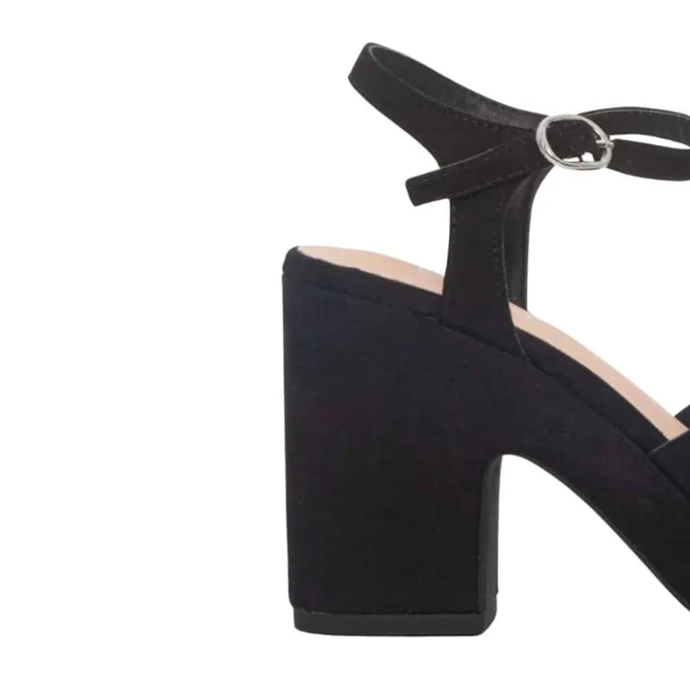 Duffy Malvizzo Uno sandal til dame i sort. Stilfuld sandal i et sort klassisk og tidsløst design, fremstillet af imiteret ruskind. Sandalen er løftet med en plateausål, mens sandalens blokhæl måler ca 6,5 cm. Desuden har sandalen flotte detaljer i form af krydsremme foran samt en justerbar ankelrem.