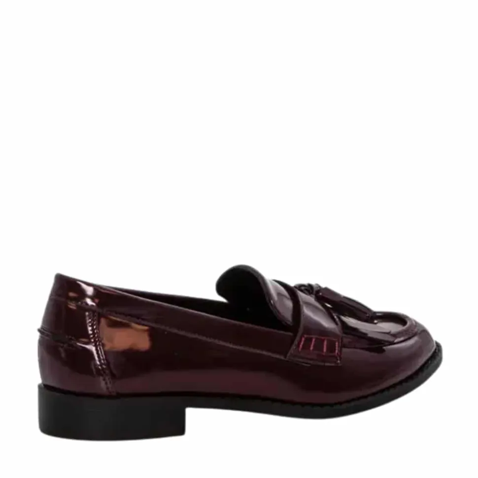 Duffy Pedalino Due loafers til dame i bordeaux lak. Disse moderne loafers i bordeaux lak kombinerer et klassisk design med fine flæsedetaljer foran, der tilfører et feminint touch. Den fleksible åbning gør det nemt at komme i og af skoen og giver en god pasform. Indvendigt finder du en blød indersål, som sikrer komfort hele dagen, og hælen på cirka 2,5 cm fuldender looket med et elegant løft.