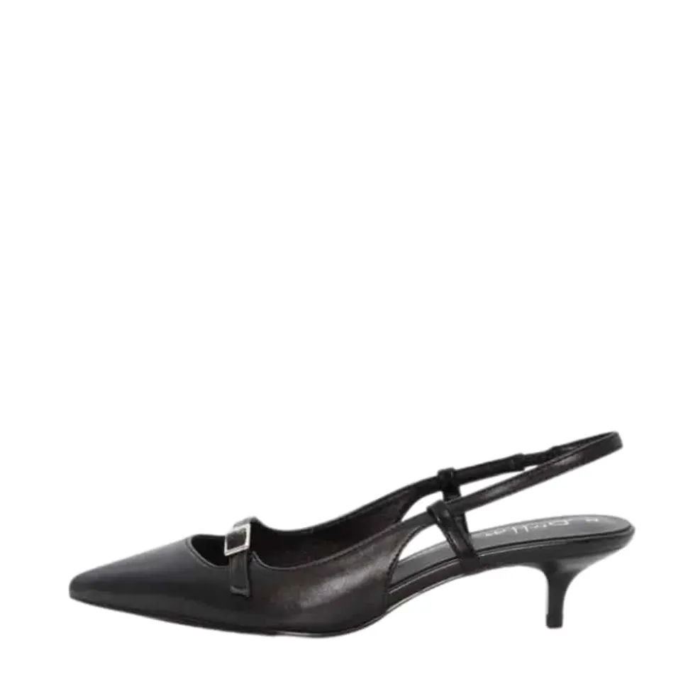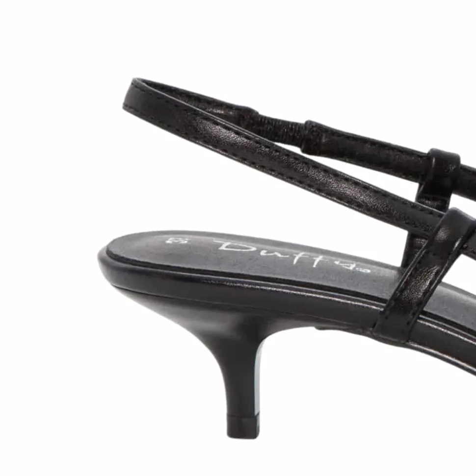 Duffy Pomezia Uno pumps til dame i sort. Moderne pumps i klassisk sort med spids snude og et elegant spænde, der giver modellen et stilfuldt udtryk. Skoen har en slingback hælrem med elastik, som sikrer en behagelig pasform og gør den nem at have på. Indvendigt sørger den bløde indersål for komfort hele dagen, mens stilethælen på 5 cm tilføjer et flot og feminint løft.