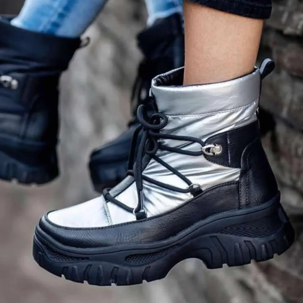 Duffy støvle til dame i sølv. Elegant og komfortabel støvle i en moderne sølvfarve, der giver støvlen et stilfuldt touch. Støvlen er designet med snørebånd foran og en praktisk lynlås på indersiden, som gør det hurtigt og nemt at få den af og på. Indvendigt bliver man mødt af en dejlig varm foring, der holder fødderne behageligt varme på kolde dage. Med den indbyggede D-Tex teknologi sikres en effektiv vandafvisning, som gør støvlen ideel til det danske vejr. Den chunky ydersål tilføjer et råt touch, samtidig med at komforten er i top.