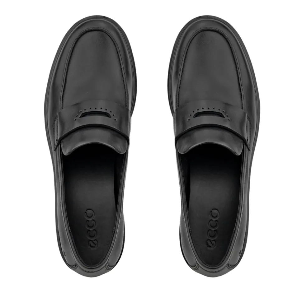 Ecco Metropole Vienna loafers til dame i sort. Denne sorte loafers har et moderne udtryk med en fin detalje over forfoden, der fuldender det stilrene look. Overdelen er lavet i 100% læder, og indvendigt får du en blød skindsål med Dual Fit, som kan tages ud for at justere pasformen efter behov. Skoen har en chunky ydersål på cirka 4 cm, som giver både højde og støtte. Mønsteret under sålen øger skridsikkerheden og giver dig en stabil gang i hverdagen.