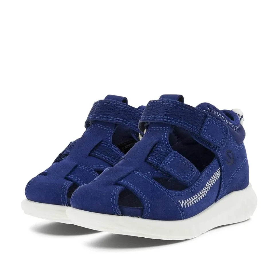 Ecco sandal i blå til børn 72514160442. Dejlig let og funktionel sandal til børn i den fineste blå farve. Modellen har to velcro-lukninger, så man nemt og hurtigt kan komme i/af den samt justere den til foden. Sandalen har lukket tå foran, så der er god beskyttelse til tæerne. Modellen har en stødabsorberende og let bund, der giver god komfort.