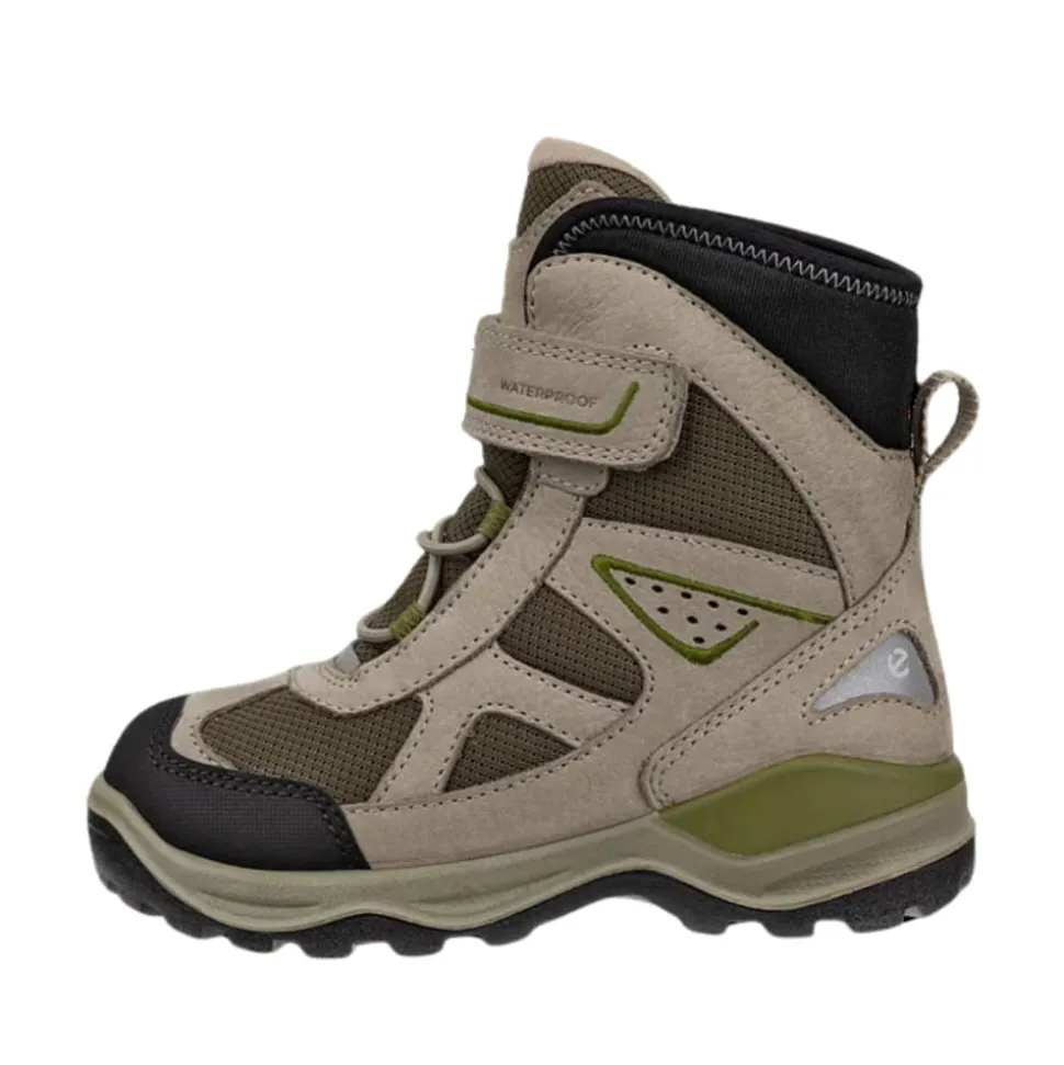 Ecco Snow Mountain vinterstøvle til børn i grøn/khaki. Disse vinterstøvler til børn er den perfekte følgesvend til vinterens sjove oplevelser. Støvlen giver fuld støtte og er foret med blødt tekstil for ekstra varme. Med ECCO FLUIDFORM™ teknologi sikres en fremragende komfort og pasform, mens PU/gummi-sålen er klar til intens leg. Den PFAS-fri vandtætte membran holder små tæer tørre, selv i vådt vejr. Støvlen er lavet af førsteklasses læder og tekstil med reflekterende detaljer, der giver ekstra synlighed. De dobbelte velcrolukninger gør den nem at tage af og på, samtidig med at de giver en justerbar pasform. Med en kombination af vandtæthed og varmeforing holdes børns fødder tørre og varme hele vinteren igennem.