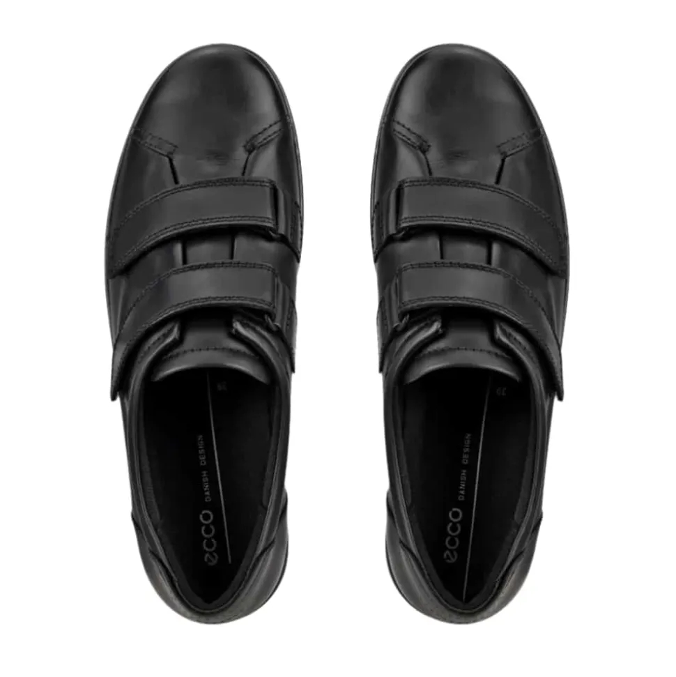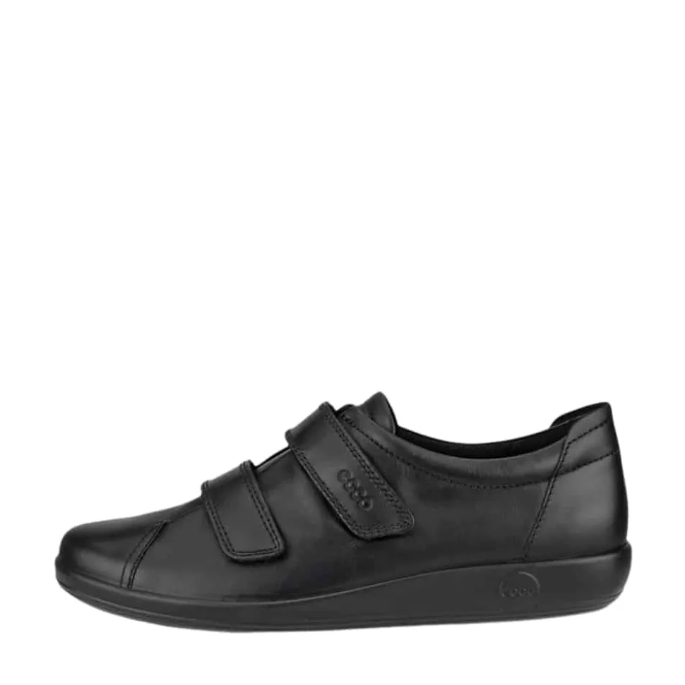Ecco Soft 2.0 sko til dame i sort. Denne sorte damesko har et klassisk design og en overdel i 100% læder, der giver et eksklusivt udtryk. To velcroremme gør skoen nem at tage af og på og sikrer samtidig en god pasform. Indvendigt sørger en blød, udtagelig indersål med ECFS™ teknologi for komfort og en kølende effekt, så fødderne holdes friske. Den slidstærke ydersål er mønstret for at give bedre støtte og skridsikkerhed, hvilket gør skoen ideel til daglig brug.