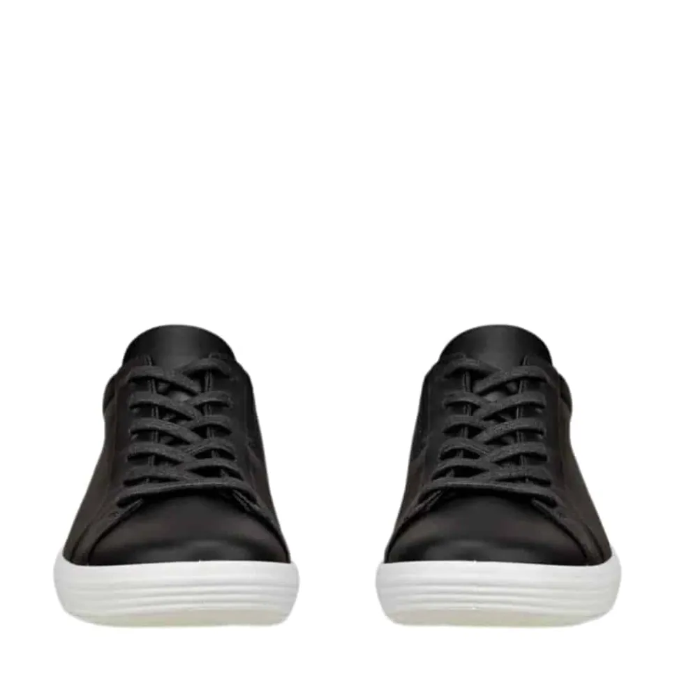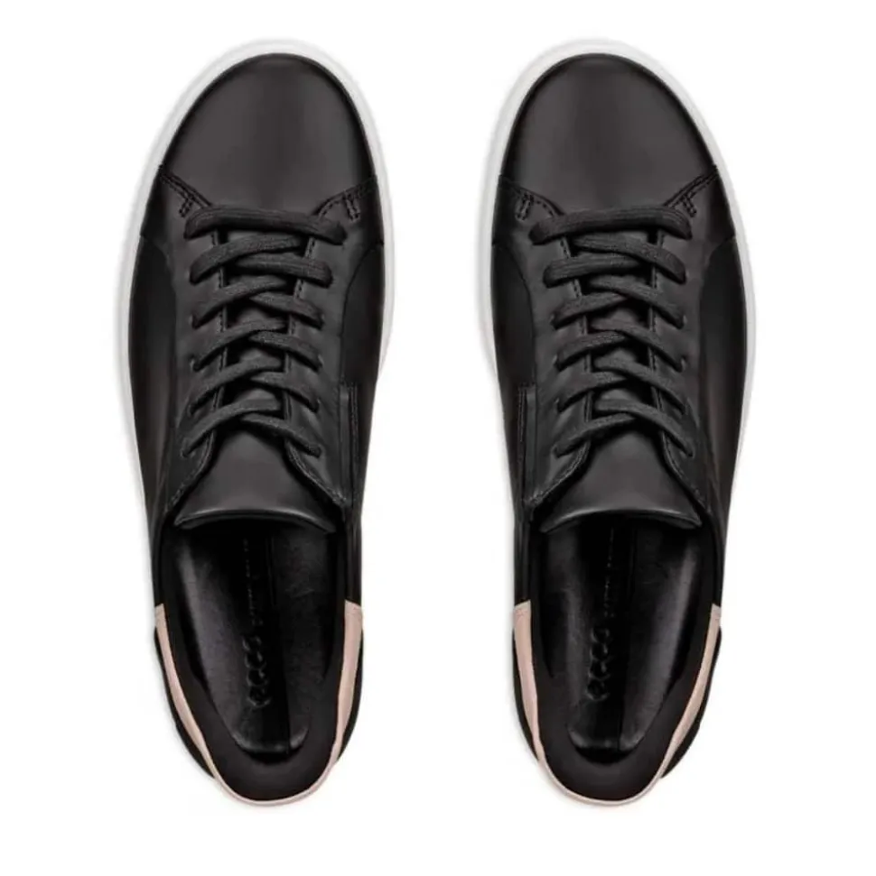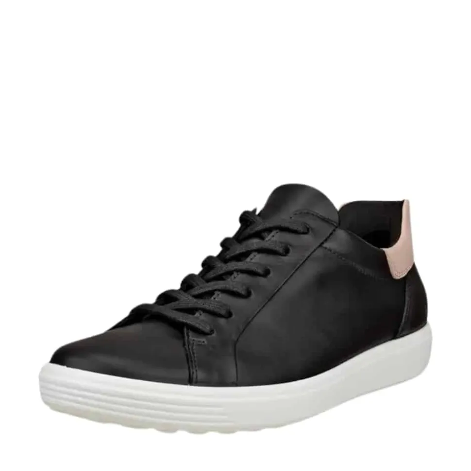 Ecco Soft 7 Easy Slip Lace sneakers til dame i sort. Disse moderne sneakers i klassisk sort med en elegant lyserød detalje på hælen balancerer perfekt mellem stil og komfort. Overdelen i glatskind giver et tidløst og eksklusivt udtryk, mens slip-in funktionen med fast hælkap gør skoen nem at tage på og af. Snørebåndene gør det muligt at justere pasformen, så den sidder helt rigtigt. Med den ekstra brede pasform får dine fødder masser af plads og komfort hele dagen. Indersiden er udstyret med en blød Ecco Fluidform™ indersål af skind, der tilpasser sig fodens naturlige form for optimal støtte. For endnu større fleksibilitet kan indersålen nemt tages ud efter behov.