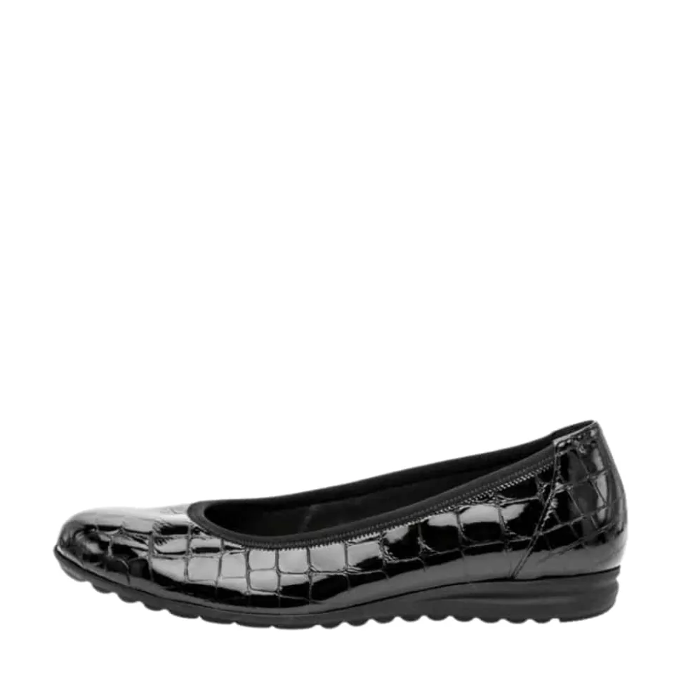 Gabor ballerinasko til dame i sort. Elegant ballerina i klassisk sort med en stilfuld lakoverflade og krokodillemønster, der tilføjer et moderne touch. Indvendigt sørger en blød skindsål for høj komfort, mens den ekstra bredde (G) sikrer en rummelig og behagelig pasform. Skoen har en lille kilehæl på 2,5 cm, der giver et let løft, og den skridsikre ydersål bidrager til stabilitet hele dagen