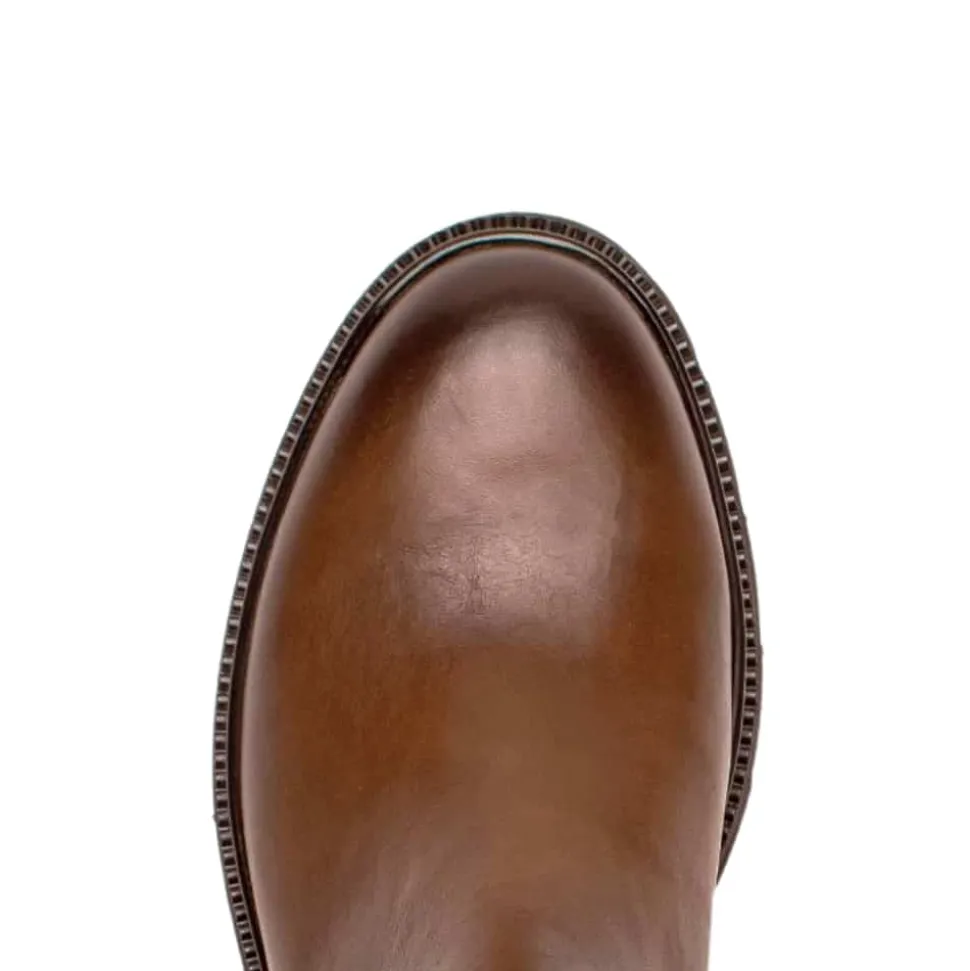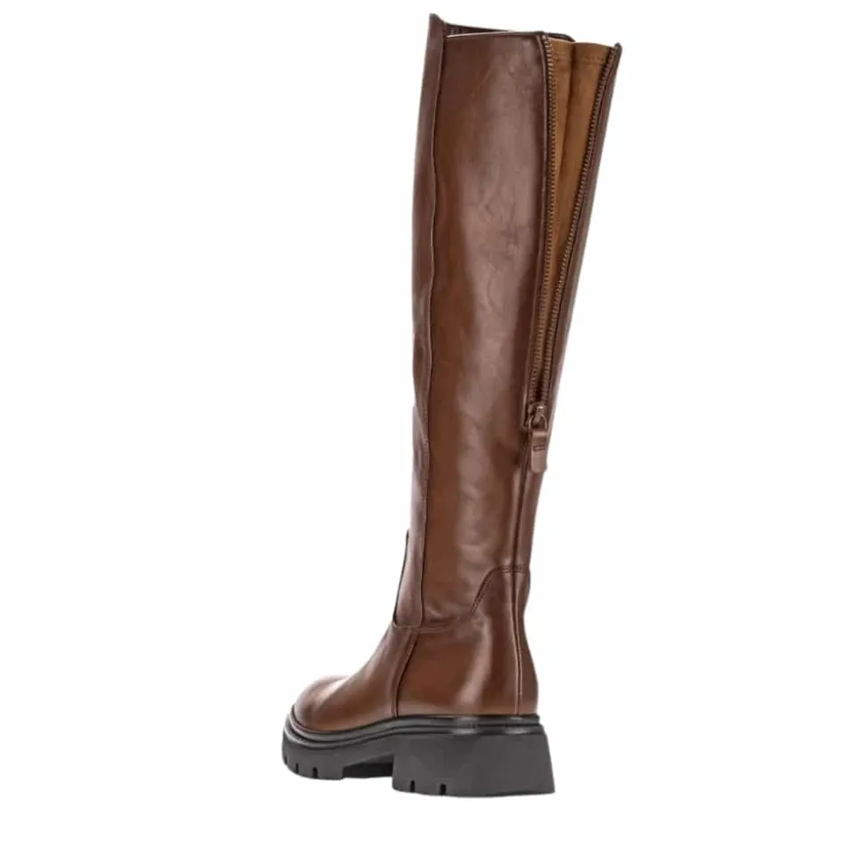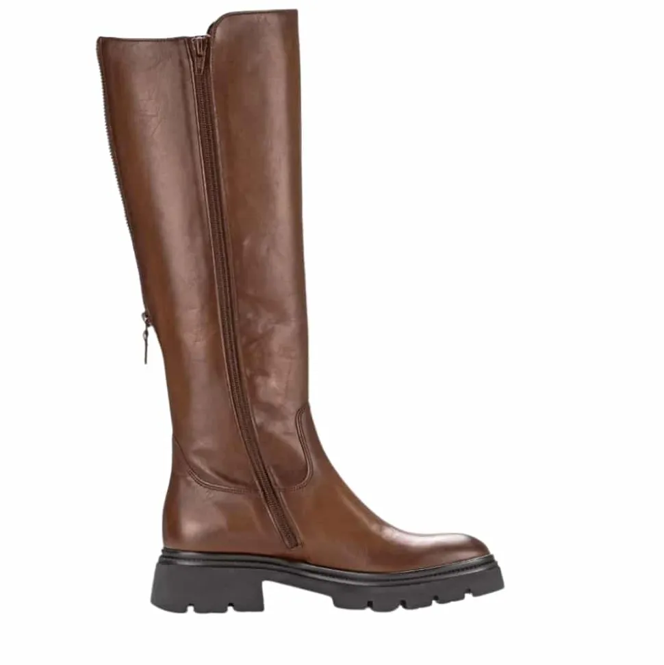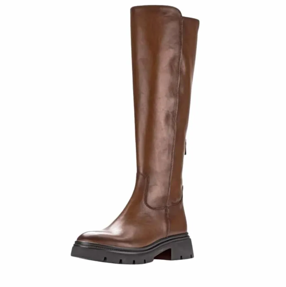 Gabor lang støvle til dame i brun. Denne lange brune støvle er fremstillet i skind og kombinerer klassisk elegance med praktiske detaljer. Støvlen har en funktionel lynlås bagpå, som giver en rummelig pasform og et feminint udtryk, mens lynlåsen på indersiden gør den let at få af og på. Indvendigt er støvlen udstyret med en blød, udtagelig sål og en let foring, som giver behagelig komfort dagen igennem. Den chunky ydersål er mønstret og sikrer godt greb og øget skridsikkerhed.