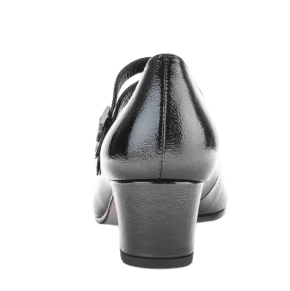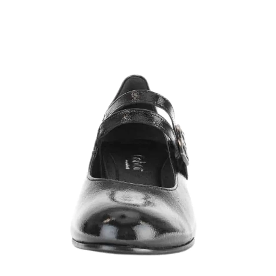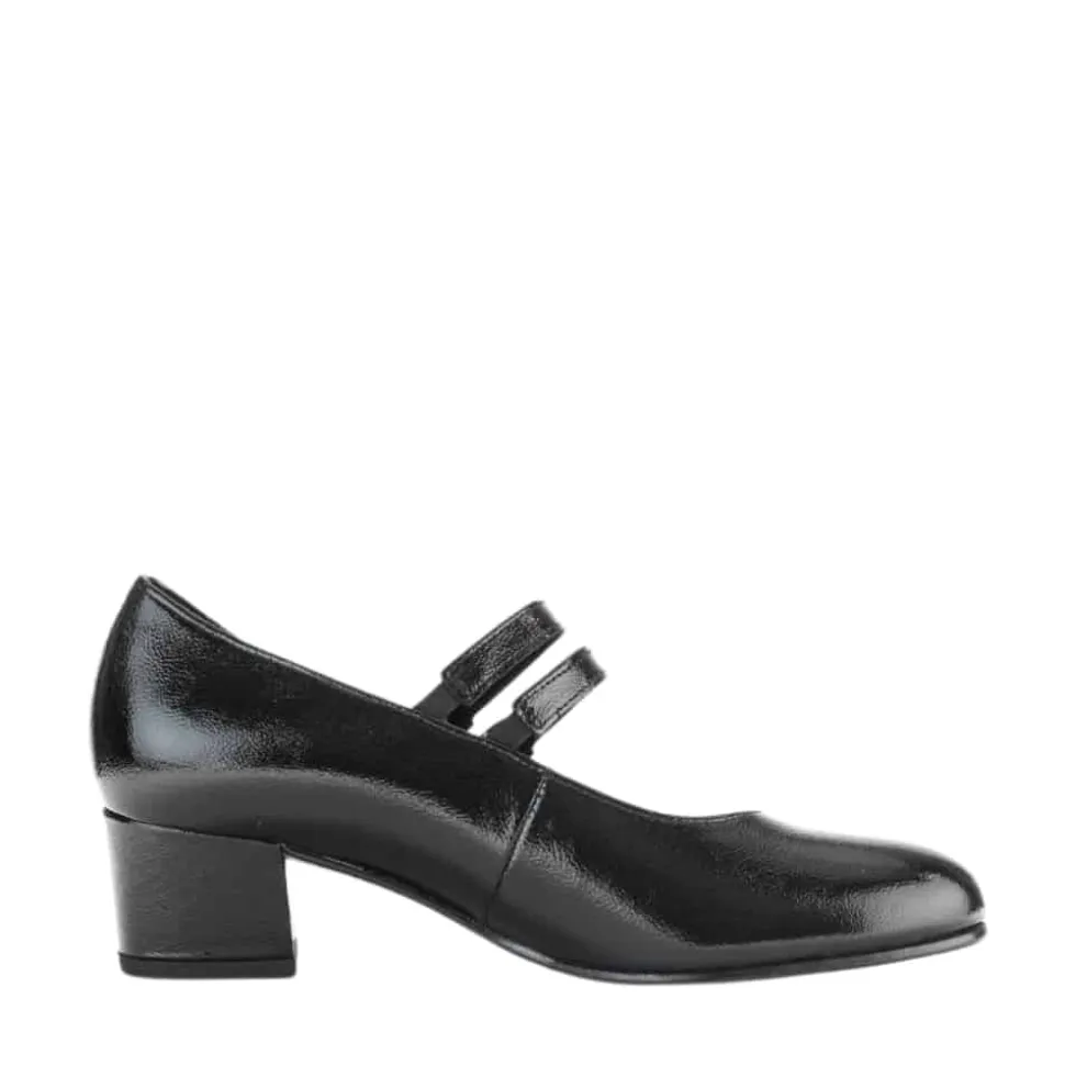 Gabor pumps til dame i sort lak. Denne moderne damesko i sort er designet med en elegant lakoverdel, som tilføjer et sofistikeret udtryk. Skoen har to remme med justerbare spænder og en lille elastik over vristen, der sikrer en god og fleksibel pasform. Indvendigt giver den bløde skindsål og ekstra vidde G både komfort og rummelighed. Den 5 cm høje blokhæl giver et stilfuldt løft, uden at det går ud over komforten.