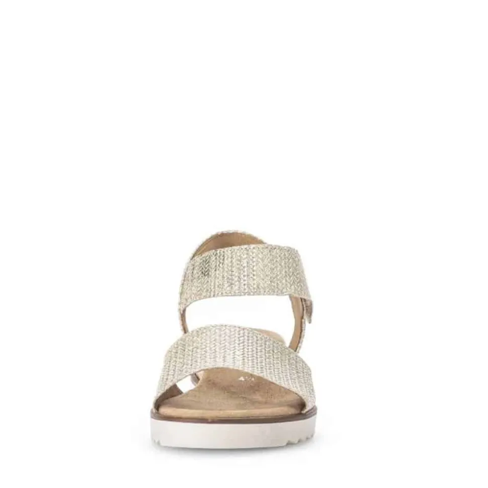 Gabor sandal til dame i guld. Super smuk sandal i en moderne guld farve, med et flot mønster på remmene. Sandalen har en dejlig skindoverdel og blød sål der er integreret med Gabor Comfort. Desuden har sandalen en kilehæl der måler ca 4,5 cm. Sandalen har en god og solid sål, med et godt mønster under sålen der øger skridsikkerheden.