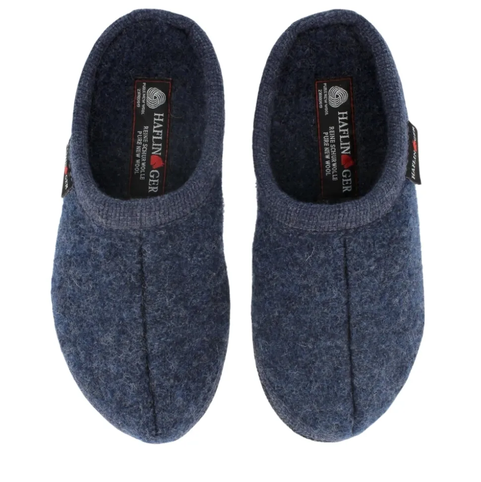 Haflinger Alaska hjemmesko i blå til dame og herre. Den perfekte hjemmesko til ren komfort. Denne model er lavet af 100% uld med en strikket overdel og en formstøbt uldfilt sål, der former sig efter foden for en behagelig pasform. Uldmaterialet sørger for optimal temperaturregulering og åndbarhed, så dine fødder holdes varme uden at føles fugtige. De 10 mm tykke filtsåler har en let latexbelægning, som giver ekstra skridsikkerhed og beskyttelse mod fugt.