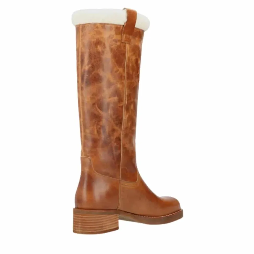 Phenumb Copenhagen Cameron Warm lang støvle til dame i cognac. Denne flotte og elegante støvle er perfekt til dig, der ønsker et tidløst design. Overdelen er lavet af læder, som gør at støvlen bliver smukkere med tiden. Indvendigt finder du en varm foring, der giver komfort på kolde dage. Den firkantede snude tilfører et moderne touch, mens blokhælen på 5 cm giver et elegant løft. Støvlen kan nemt kombineres med enhver garderobe.