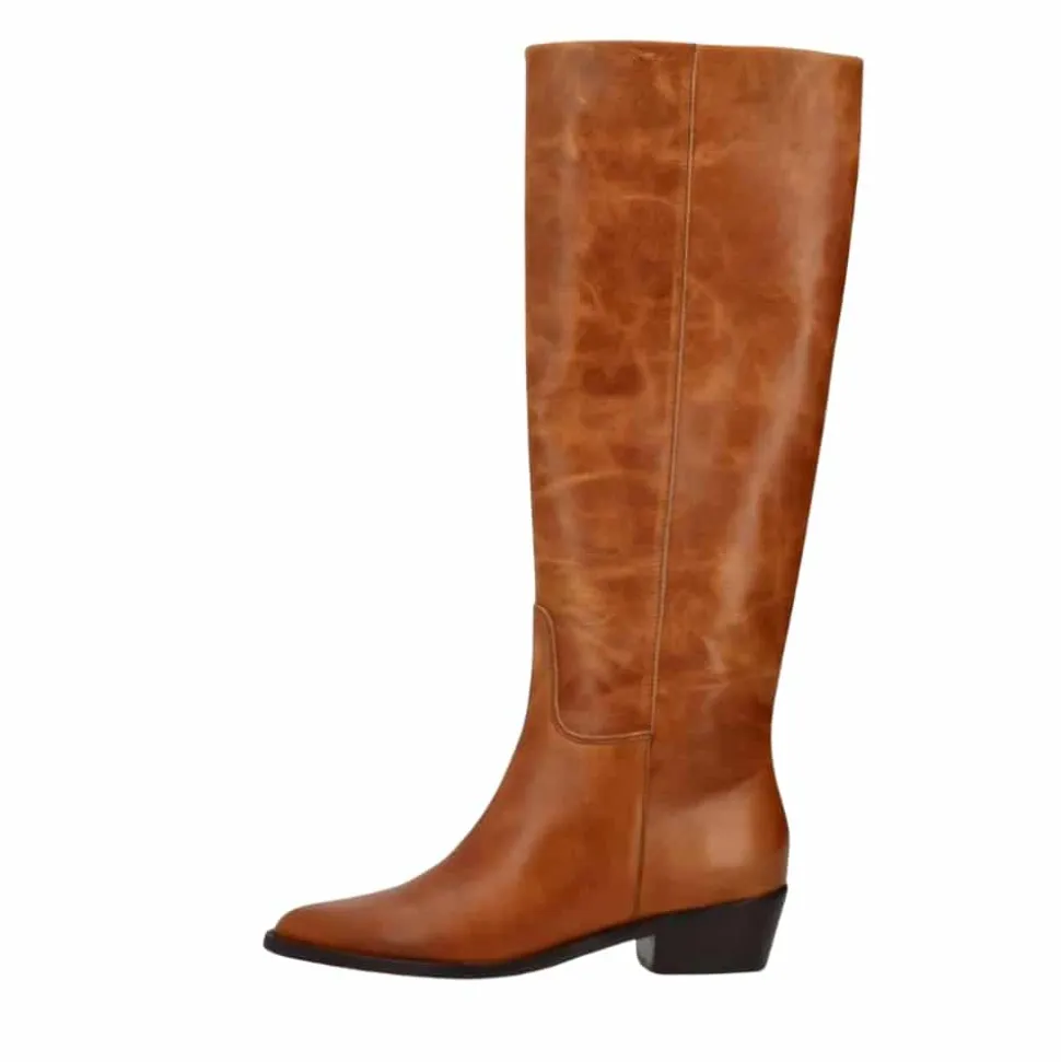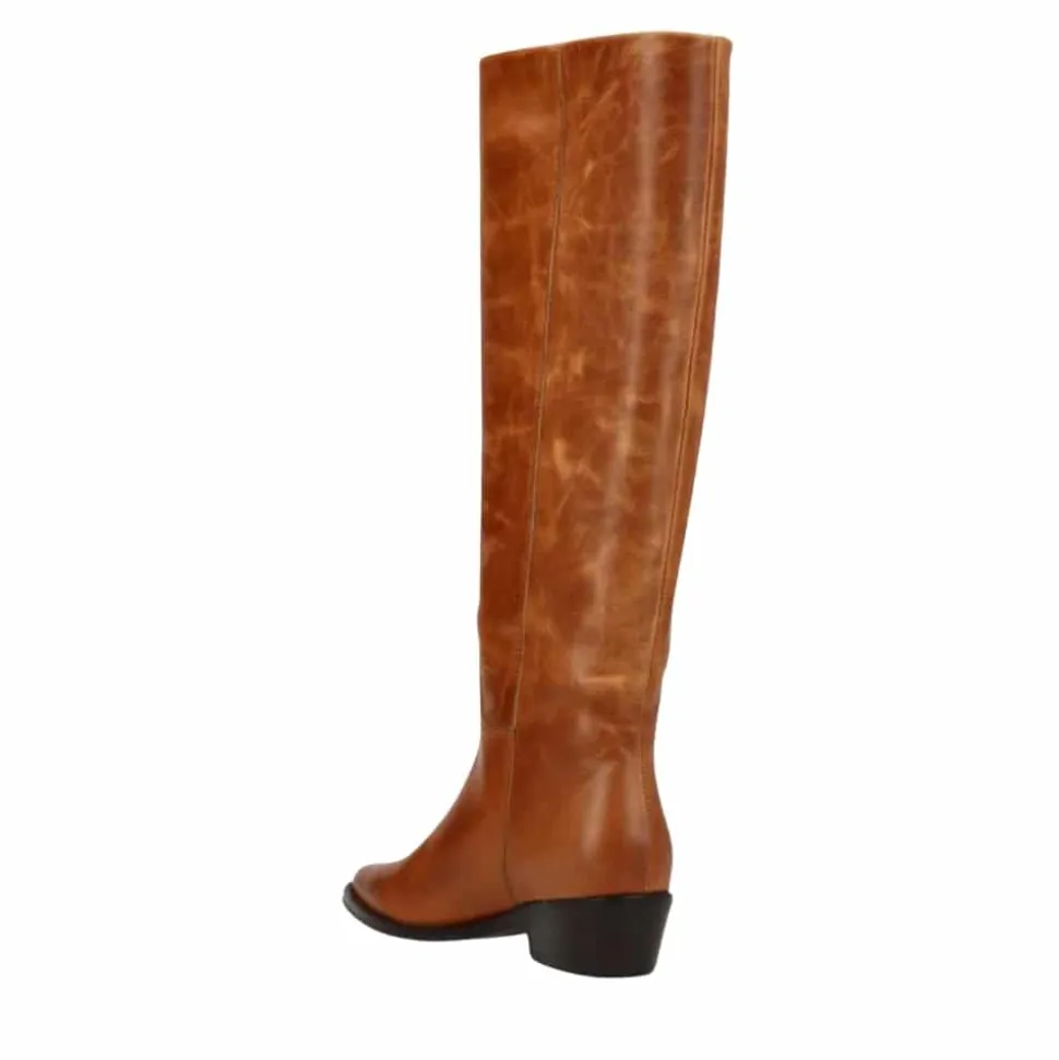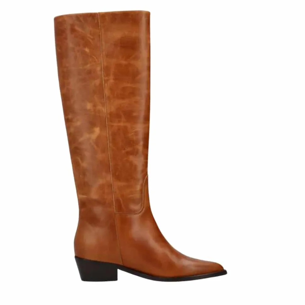 Phenumb Copenhagen Confidence lang støvle til dame i cognac. Denne moderne støvle i brun er fremstillet af kernelæder som giver både et smukt udtryk og en god pasform. Det lange skaft tilfører et feminint og elegant look. Indvendigt er modellen udstyret med en blød indersål og en inderside i glatskind, som tilsammen sikrer en behagelig komfort hele dagen. Den cirka 4,5 cm høje blokhæl fuldender designet med et flot løft, uden at du går på kompromis med komforten.