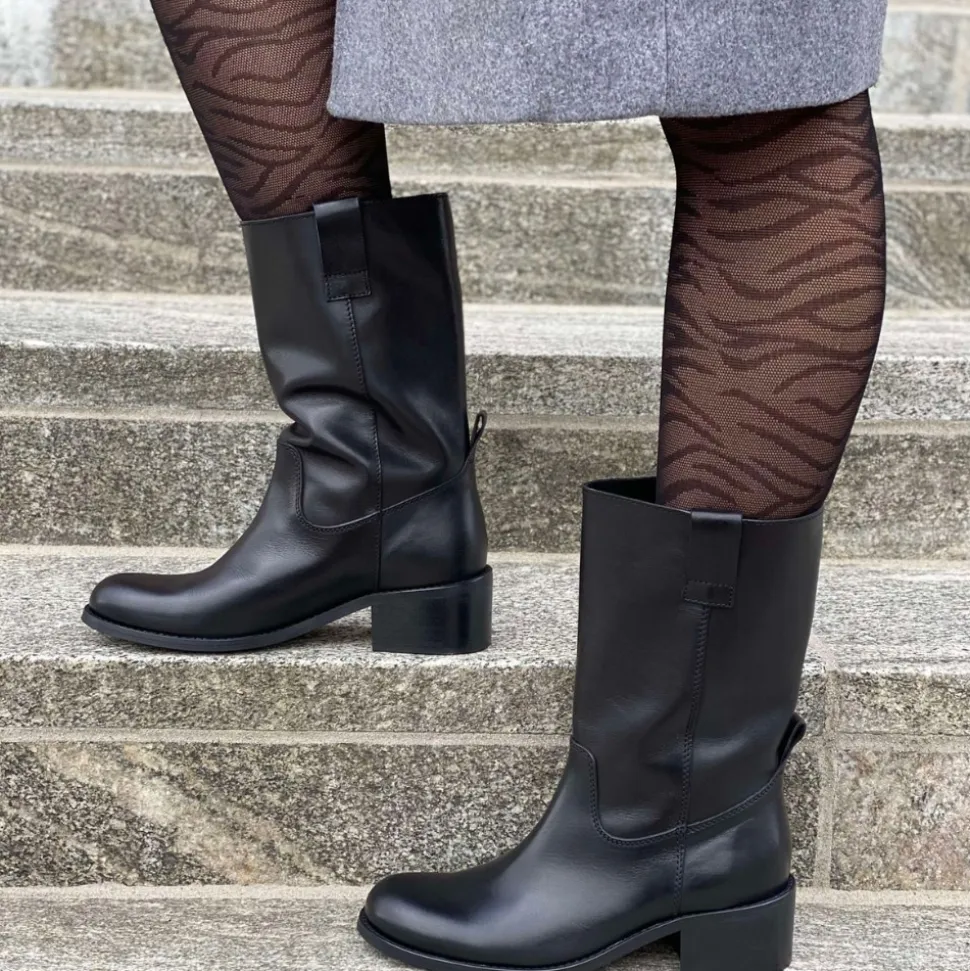 Phenumb Copenhagen Martina støvle i sort. Støvlen er fremstillet af førsteklasses skind, der ikke kun tilføjer en sofistikeret dimension til dit outfit, men også garanterer langvarig holdbarhed. Den dybe sorte farve gør denne støvle alsidig og let at matche med forskellige outfits, uanset om det er jeans, nederdele eller kjoler. Med en hælhøjde på 5 cm tilbyder støvlen den perfekte balance mellem komfort og elegance. Du får den ønskede højde uden at ofre komforten.