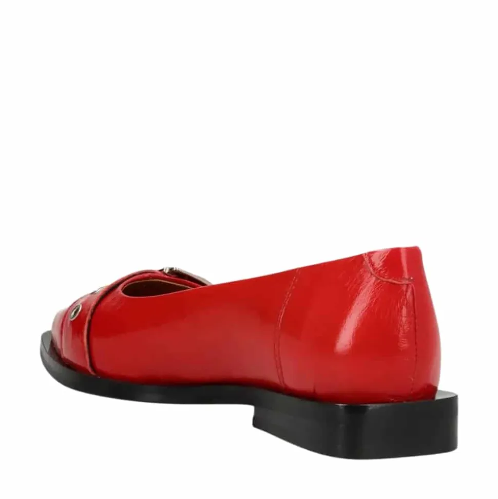 Phenumb Copenhagen MUST ballerinasko til dame i rød. Hop med på trenden med disse flotte ballerinasko i rød lak med smukke spændedetaljer, der giver skoen et råt look. Fremstillet af 100% skind og kvalitetsmaterialer, vil disse sko give dine fødder dejlig støtte og komfort, så du kan have dem på i timevis. Den spidse tå tilføjer et strejf af elegance til skoen som modspil til det rå look, hvilket gør den perfekt til både hverdagsbrug og festlige lejligheder. Disse sko er størrelsessvarende og vil være et stilfuldt valg til enhver lejlighed.