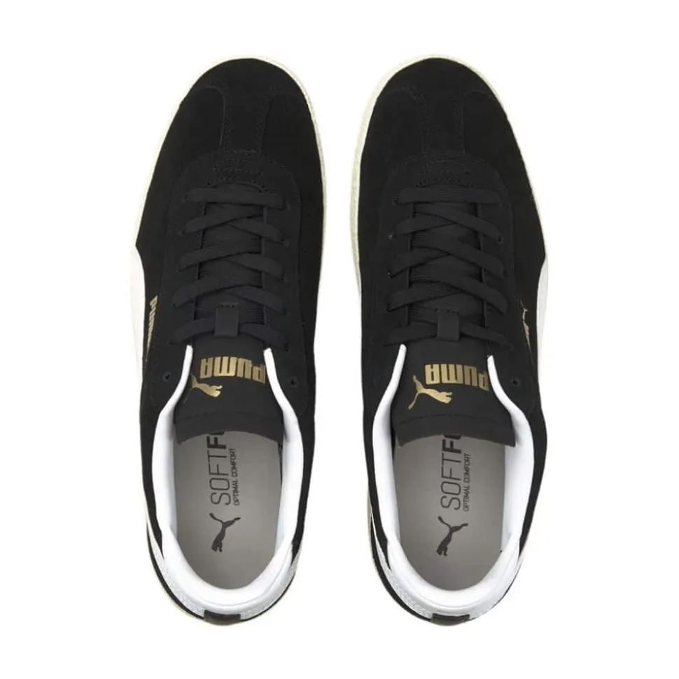 Puma Club sneakers i sort. Opnå en perfekt stil med PUMA Club Trainers, der er inspireret af fodboldens æstetik. Disse sneakers kombinerer en overdel af ruskind med klassiske PUMA-elementer, og SoftFoam+ indersålen sikrer øjeblikkelig og langvarig komfort med blød polstring ved hvert skridt. Den karakteristiske gummisål tilføjer et sofistikeret look med en sporty kant, perfekt til enhver sneaker-entusiast, der ønsker en elegant opdatering til garderoben. Skoen har en snørelukning og en ruskindstunge, mens PUMA Archive No. 1 logoet pryder tungen, og PUMA No. 2 logoet samt PUMA Formstrip ses på siden. Indersålen er 100% tekstil, ydersålen er 100% gummi, og overdelen består af kohud og syntetisk materiale, med en indvendig foring af 100% syntetisk materiale.