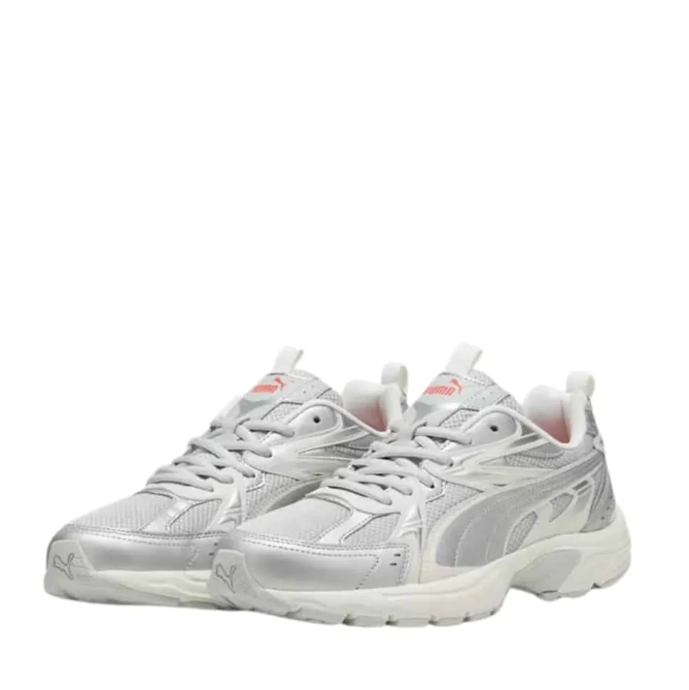 Puma Milenio Tech sneakers i sølv/metal til dame. Milenio Tech er inspireret af de populære løbesko fra årtusindeskiftet og bringer 00’ernes stil tilbage med et moderne twist. Kombinationen af frisk mesh og skinnende metalliske toner giver skoen et både stilfuldt og behageligt udseende. Skoens SOFTFOAM+ indersål sikrer ekstra blød polstring og komfort ved hvert skridt takket være en ekstra tyk hæl. Overdelen er lavet af luftigt air mesh, mens mellemsålen er fremstillet af let IMEVA, og ydersålen består af slidstærkt gummi. Det ikoniske PUMA Formstrip pryder siderne, og PUMA No.1 logoet på tungen samt PUMA Cat logoet på hælen fuldender looket. Indersålen er 100% tekstil, ydersålen er 100% gummi, og overdelen består af syntetisk materiale og tekstil, hvilket giver en perfekt balance mellem holdbarhed og åndbarhed.