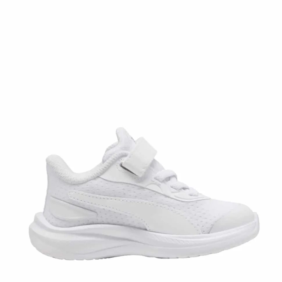 Puma Skyrocket 2 AC Sneakers til små børn i hvid. Smart sneakers i en flot hvid farve med Puma detaljer, som giver et pænt og sporty udtryk. Skoen har en velcrorem foran, der gør det nemt at tage skoen af og på, mens elastikken hjælper med at give en god pasform. Indvendigt er skoen udstyret med en blød og udtagelig SoftFoam+ indersål, som giver god komfort til små fødder hele dagen. Ydersålen i gummi er let og har et mønster, der giver øget skridsikkerhed ved leg og bevægelse.