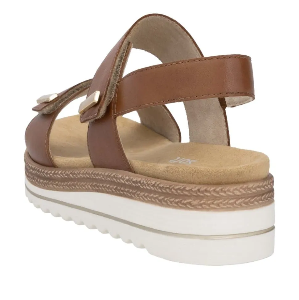 Remonte sandal til dame i brun. Stilfuld og komfortabel sandal i brunt skind med elegante gulddetaljer, der tilfører et eksklusivt look. Sandalen har to justerbare velcroremme, som sikrer en fleksibel pasform og gør den nem at tage af og på. Hælremmen er udstyret med en elastisk indsats, der giver ekstra bevægelighed og komfort. Den bløde Remonte Soft-indersål sørger for behagelig støtte hele dagen og kan tages ud efter behov. Den lette og stødabsorberende ydersål sikrer en blød gang, mens den 4,5 cm høje kilehæl tilfører et feminint og stilrent løft.