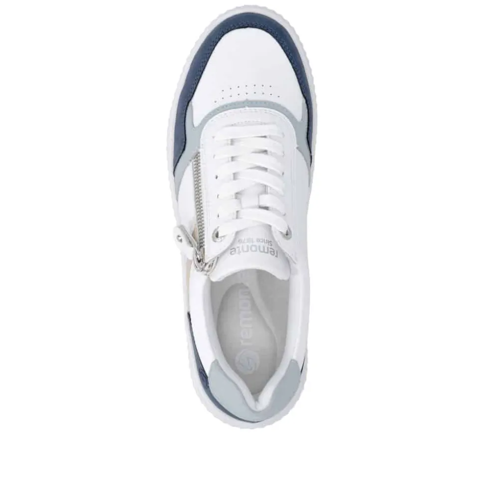 Remonte sneakers til dame i hvid. Disse smarte sneakers med skindoverdel i hvid og blå detaljer kombinerer stil med praktiske løsninger til hverdagen. Skoen er udstyret med både snørebånd og en funktionel lynlås, så pasformen nemt kan justeres efter foden. Indvendigt bliver du mødt af en blød og udtagelig indersål samt ekstra bredde (H), som giver god rummelighed og høj komfort hele dagen. Ydersålen er designet med et mønster, der giver øget stødabsorbering og skridsikkerhed i hvert skridt.