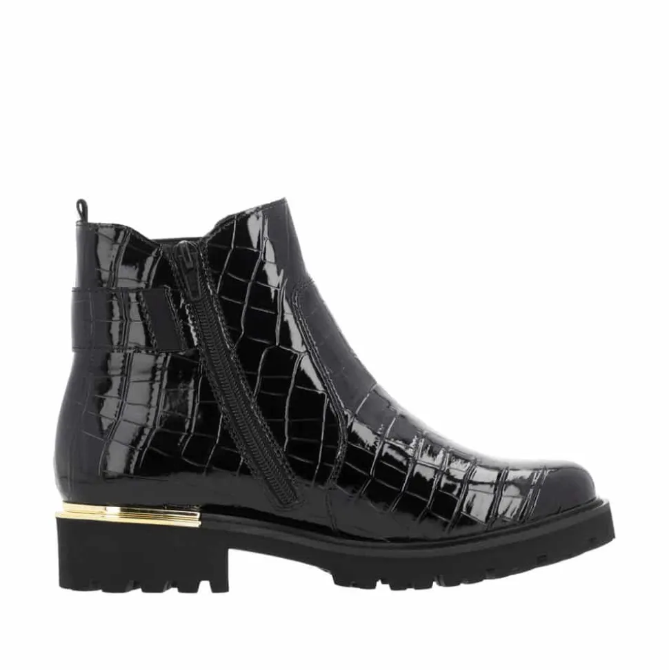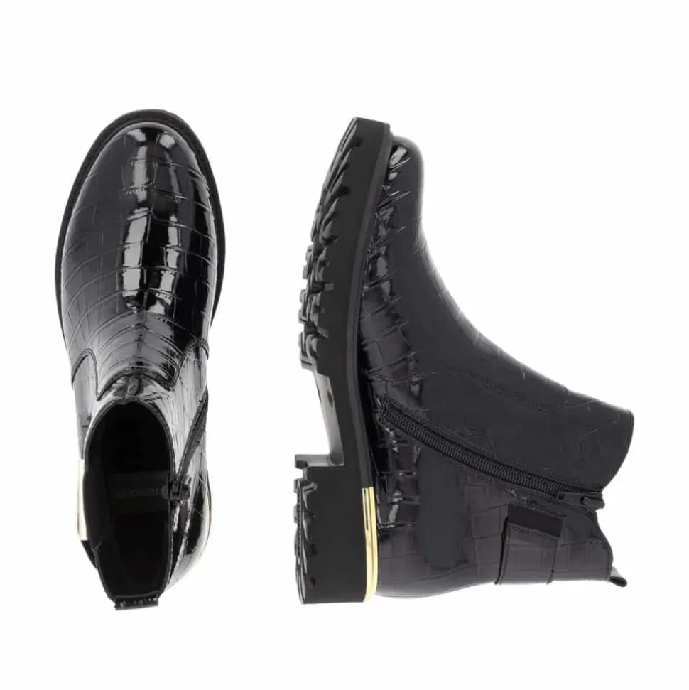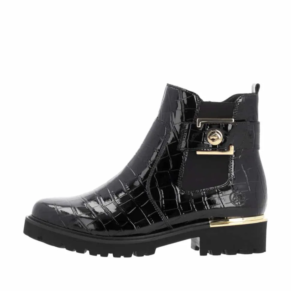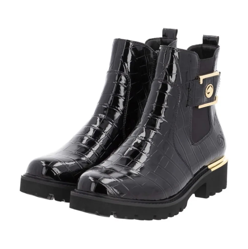 Remonte støvle til dame i sort. Denne super moderne støvle i en elegant sort farve med krokodillemønster og lak finish giver et ekstra sofistikeret touch. Støvlen er smukt dekoreret med gulddetaljer på siden og bag hælen. Indvendigt bliver du mødt af en let foring og en blød indersål, der kan tages ud efter behov. Med den praktiske lynlås på indersiden og elastikken på ydersiden er det nemt og hurtigt at tage støvlen af og på. Den robuste chunky sål med et godt mønster giver øget støtte og skridsikkerhed.