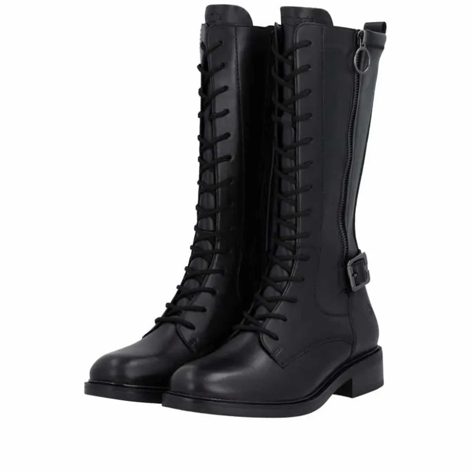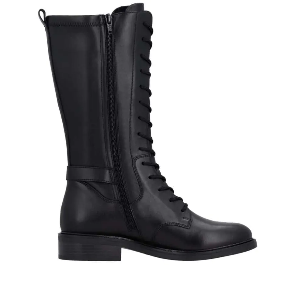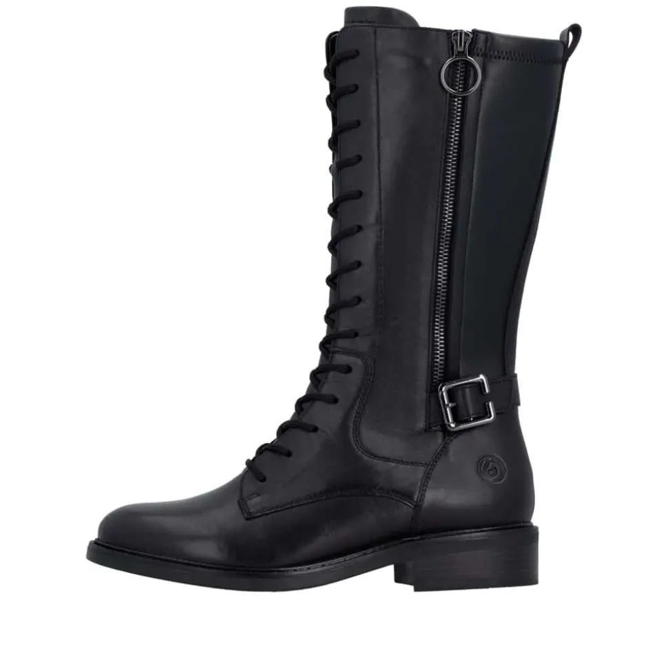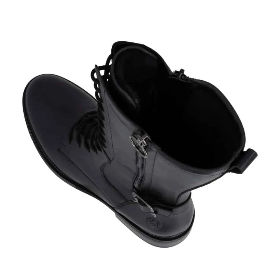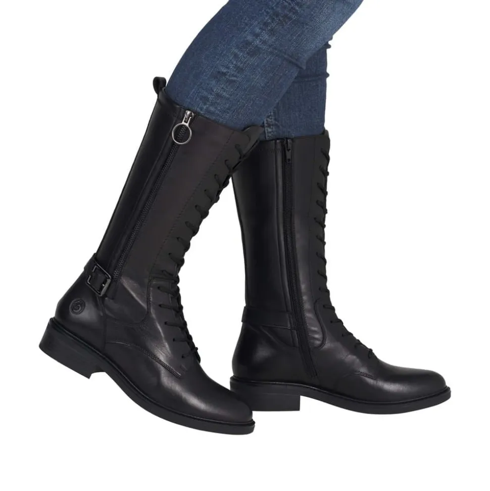 Remonte støvle til dame i sort. Moderne sort støvle med pynte lynlås og spænde på siden samt mellemlangt skaft, som giver et stilfuldt og feminint udtryk. Overdelen er fremstillet i skind, og støvlen er udstyret med snørebånd foran og en funktionel lynlås på indersiden, så den er nem at tage af og på. Indvendigt finder du en let foring og en blød, udtagelig Remonte-Soft sål, der sikrer høj komfort hele dagen. Den lille blokhæl på ca. 3,5 cm fuldender designet med et elegant løft, uden at det går ud over komforten.