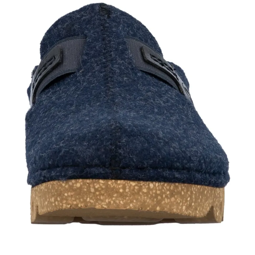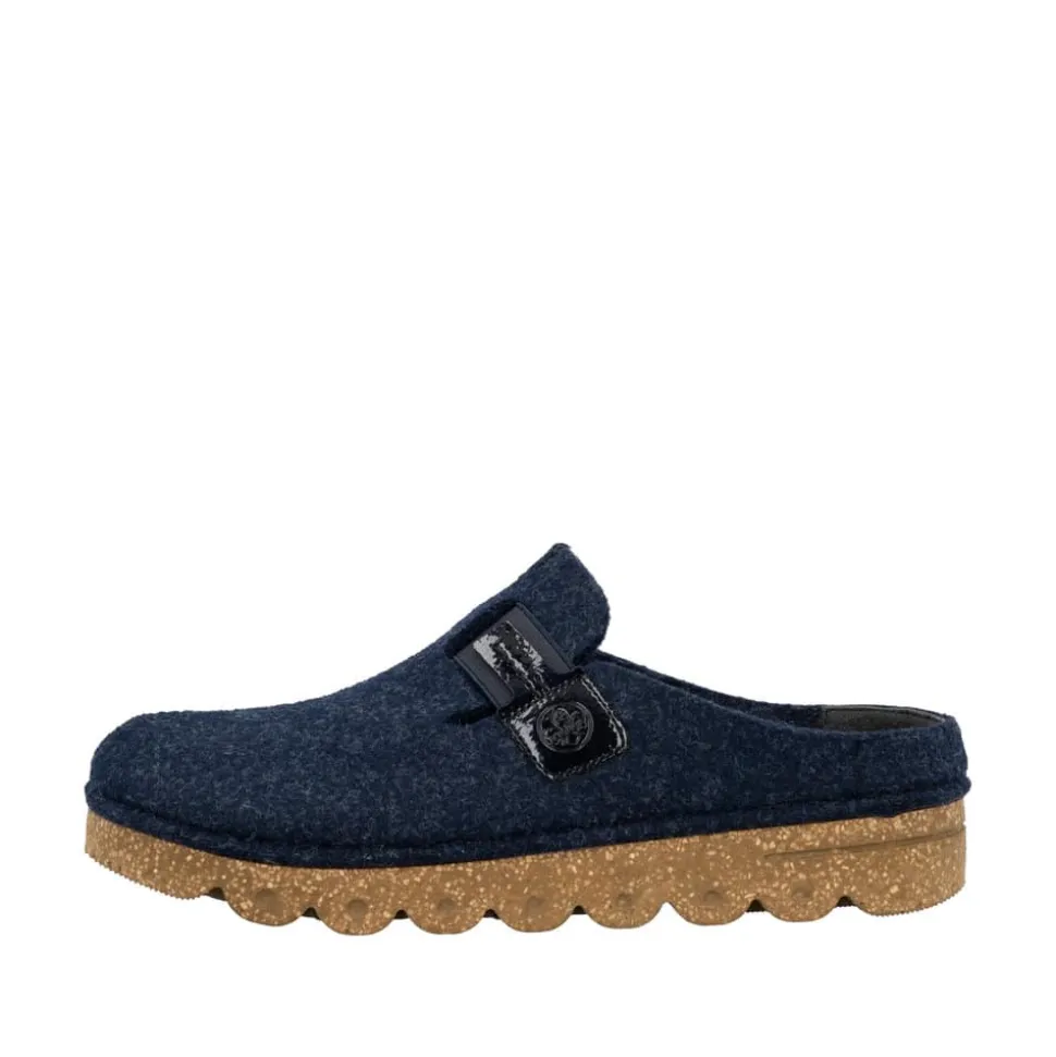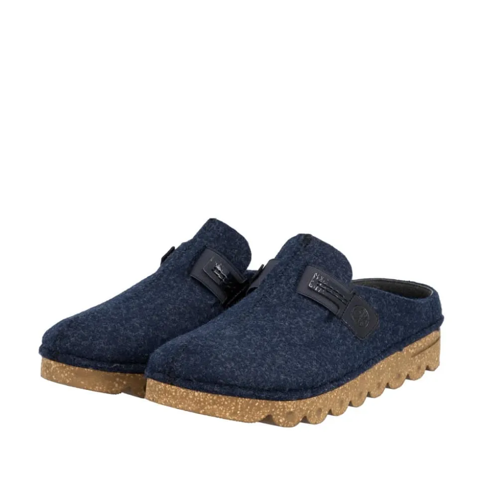 Rieker hjemmesko til dame i blå. Praktisk og komfortabel hjemmesko i filt materiale, der holder fødderne varme. Modellen har elastik, som sikrer en god pasform, og den er uden hælkappe, hvilket gør hjemmeskoen nem at komme i og af. Indvendigt finder du en blød sål, der giver behagelig komfort, mens kork ydersålen med mønster giver øget skridsikkerhed.