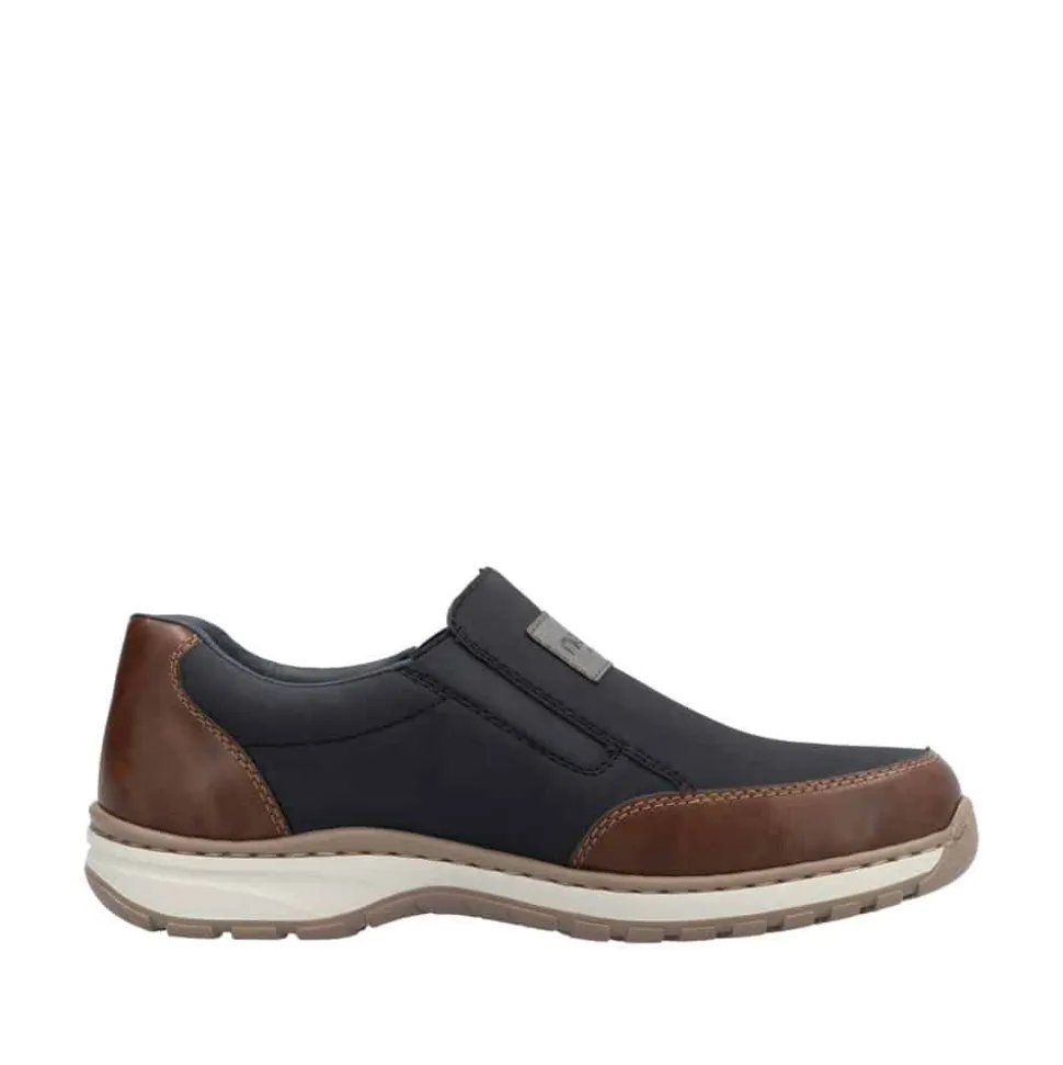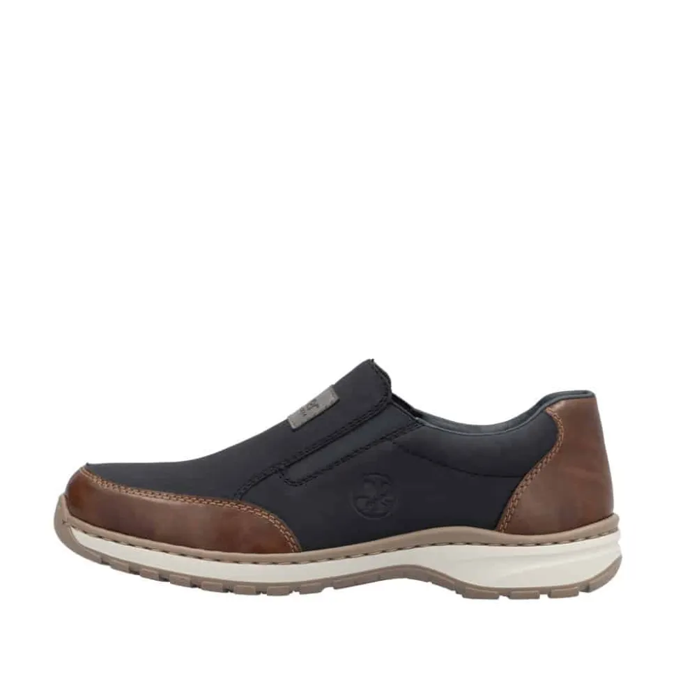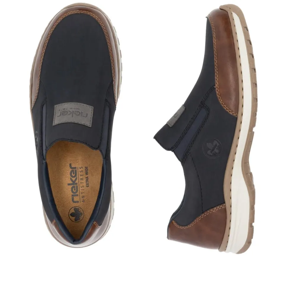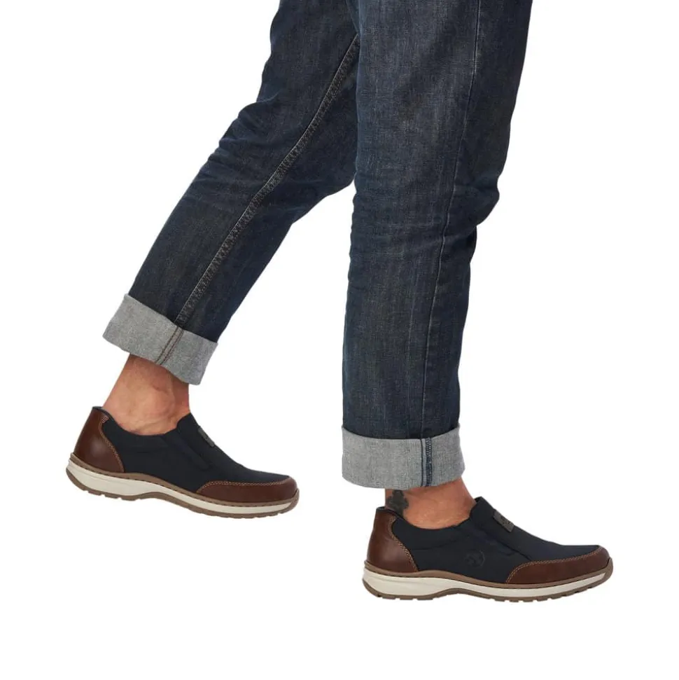 Rieker hyttesko til herre i blå. Træd ind i komforten med denne fleksible hyttesko i en smuk blå nuance. Den stødabsorberende sål sikrer en behagelig gangoplevelse, og den ekstra vidde H giver dig god plads i skoen, ideel til bredere fødder. Elastikken i åbningen og læderdetaljerne på fronten og hælkappen giver både funktion og stil – perfekt til hverdagens udfordringer.