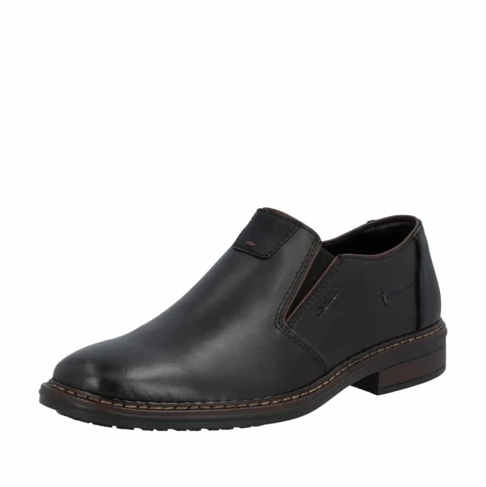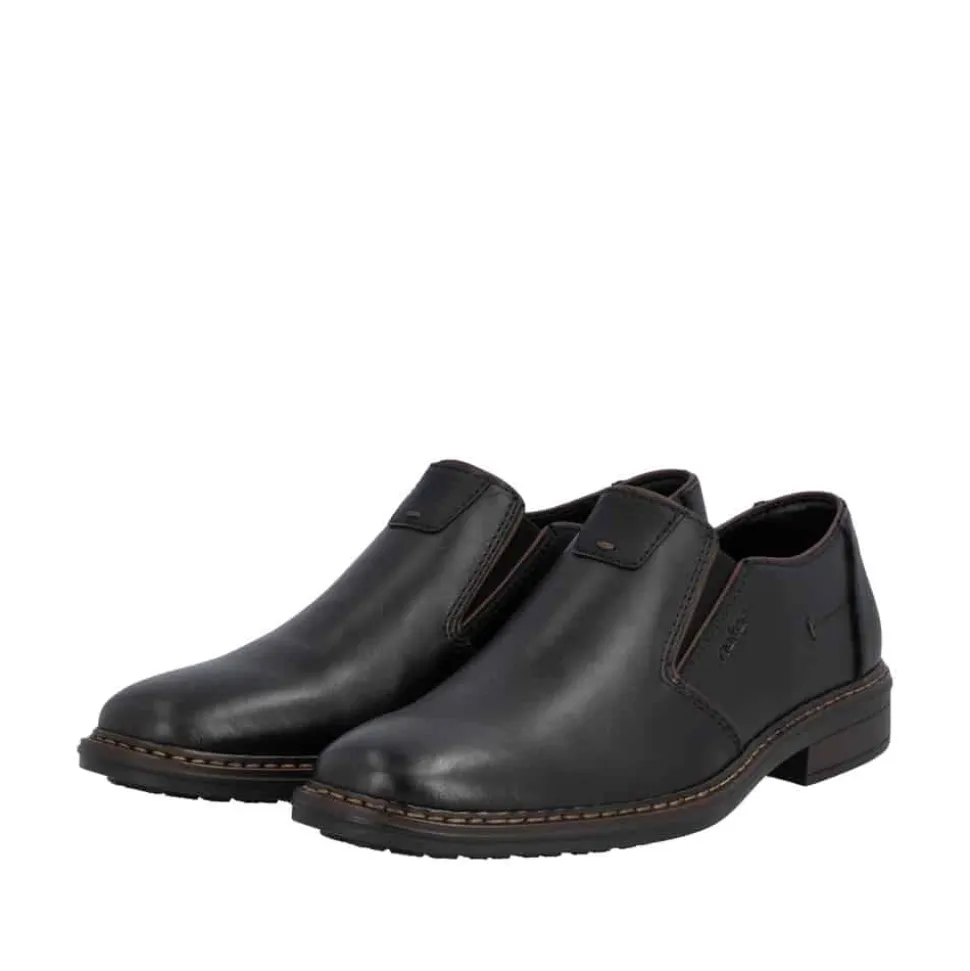 Rieker hyttesko til herre i sort. Denne flotte sko med skindoverdel er et alsidigt valg, der passer perfekt til både hverdag og finere begivenheder. Skoen har elastik, som gør den let at komme i og af og samtidig giver en behagelig pasform. Indvendigt er skoen udstyret med en blød skindsål, der sikrer god komfort hele dagen, mens ekstra bredde (H) giver god rummelighed til foden. Ydersålen er designet med et mønster, som giver øget stødabsorbering og skridsikkerhed i hverdagen.