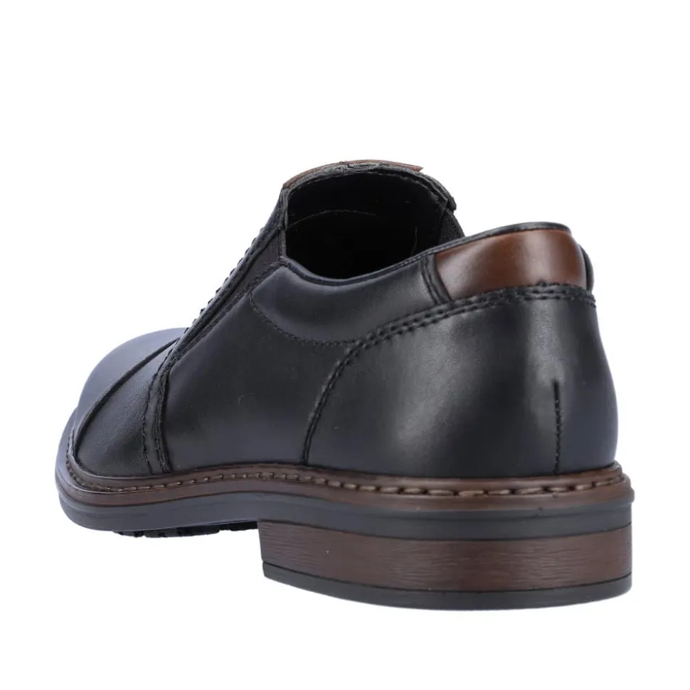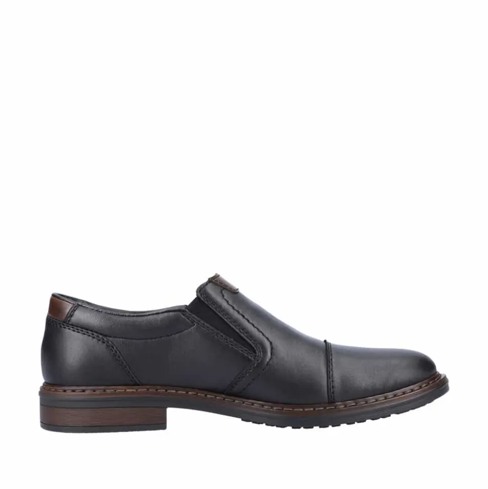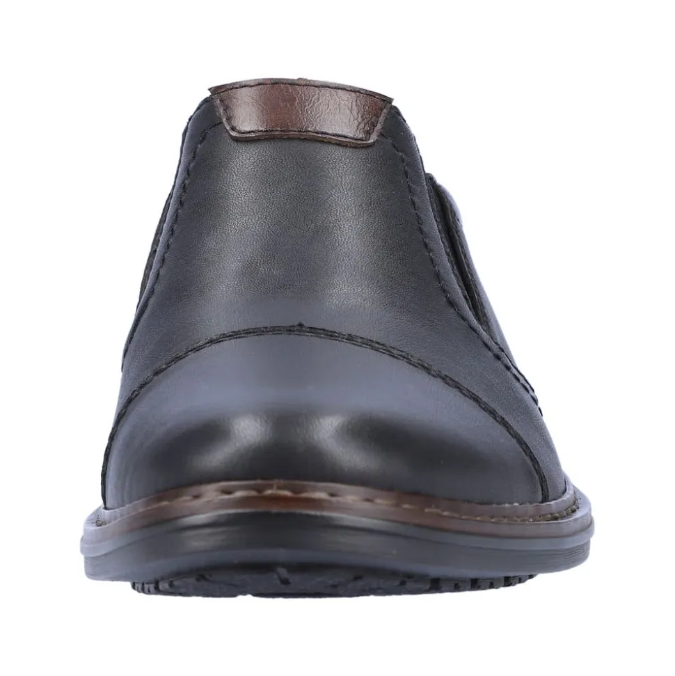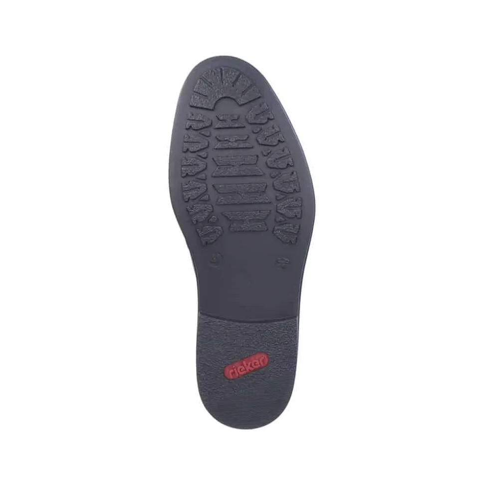 Rieker hyttesko til herre i sort. Populær hyttesko i en elegant sort farve med flotte detaljer der giver et moderne look. Skoen har en blød overdel i skind og er designet med elastik for en optimal pasform. Indvendigt bliver du mødt af en blød indersål der er designet med ekstra bredde H, der giver god rummelighed og øget komfort. Skoens har Rieker-Antistress, hvilket sikrer en let og fleksibel pasform, mens den stødabsorberende ydersål giver komfort hele dagen.
