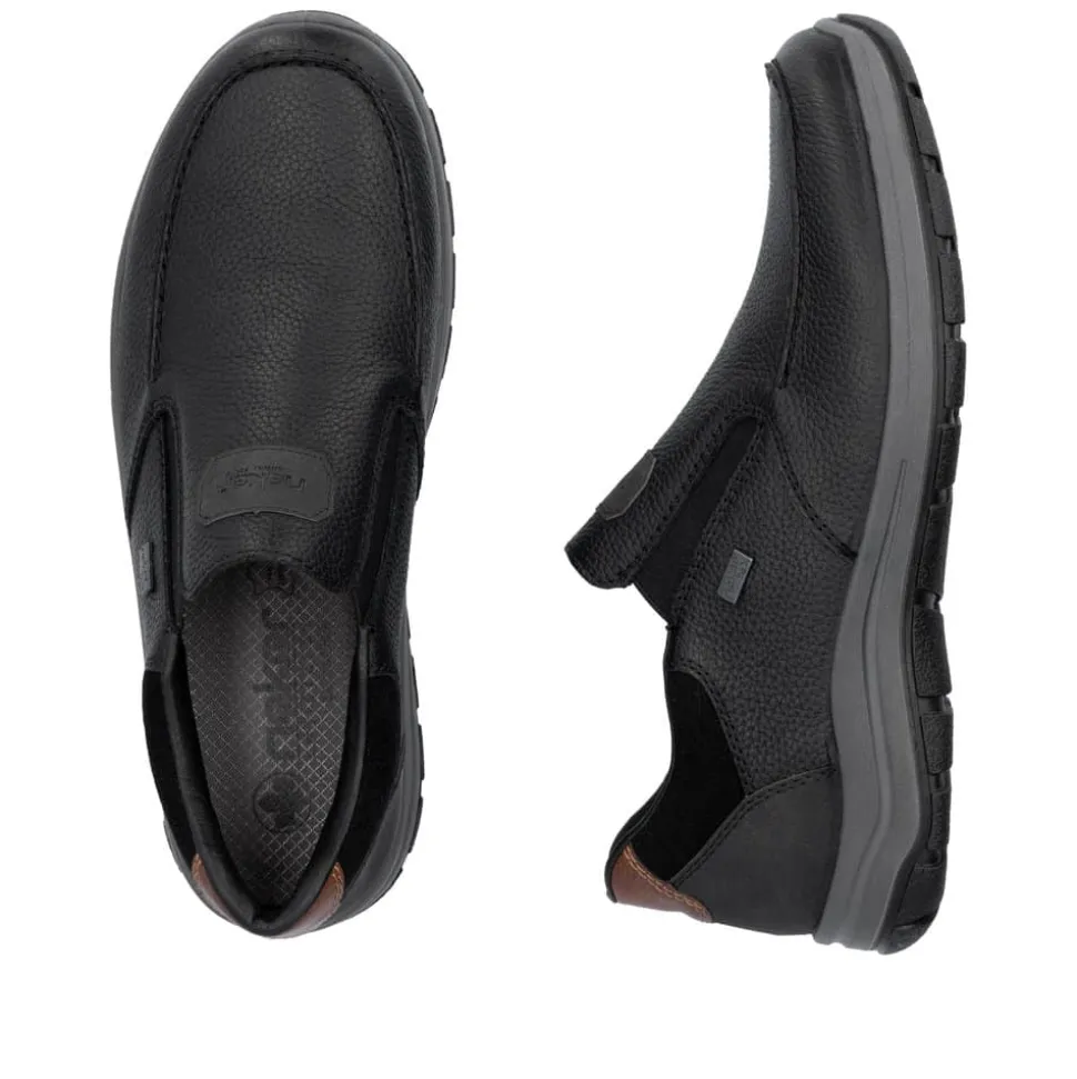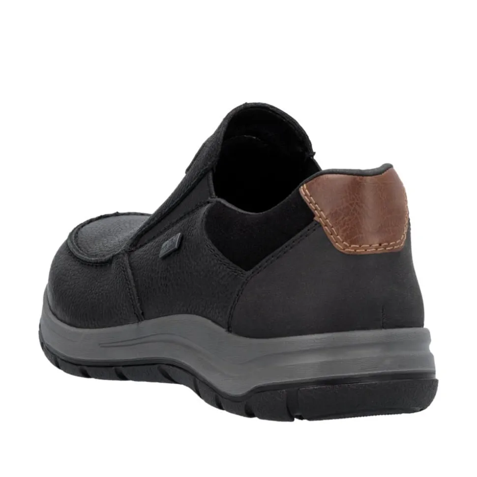 Rieker hyttesko til herre i sort. Elegant og praktisk hyttesko med en sort skindoverdel, der løfter kvaliteten og udseendet på skoen. De to elastikker gør det let at tage skoen af og på, hvilket sikrer en hurtig og nem pasform. Skoen har flotte detaljer som Rieker logoet foran og brune detaljer bagpå, der giver et stilfuldt touch. Udstyret med Rieker-Tex er modellen vandafvisende, så dine fødder holdes tørre i al slags vejr. Indersålen er blød og kan tages ud, mens den ekstra vidde sikrer optimal komfort hele dagen. Den solide ydersål har et godt mønster, der giver ekstra skridsikkerhed og støtte, sammen med Rieker Antistress-teknologien.