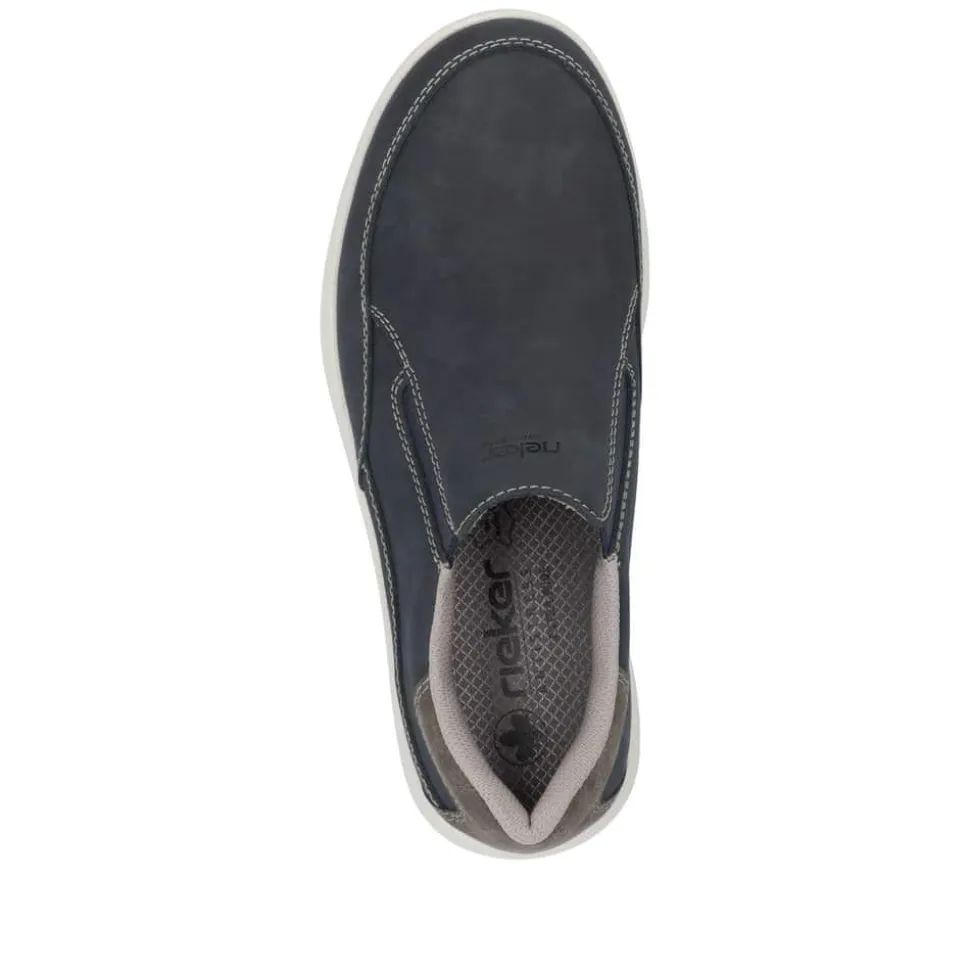 Rieker hyttesko til herre i blå. Denne klassiske hyttesko fra Rieker kombinerer stil og komfort i én sko. Med en overdel i ægte skind og elastiske sider er den nem at tage på og af. Den ekstra vidde H giver mere plads til brede fødder, hvilket sikrer en behagelig pasform hele dagen. Rieker Antistress-teknologien og den stødabsorberende sål reducerer belastningen på fødderne, mens den udtagelige bløde indlægssål giver ekstra komfort. Perfekt til både hverdagsbrug og mere afslappede anledninger.