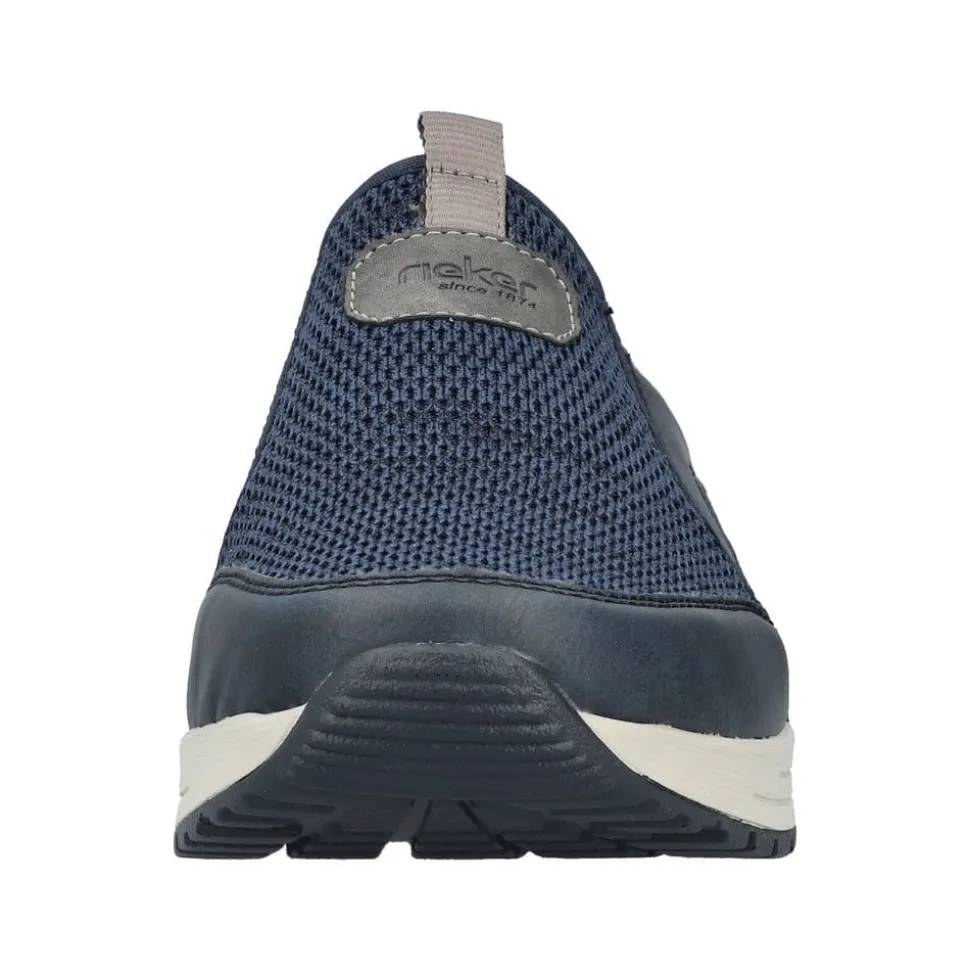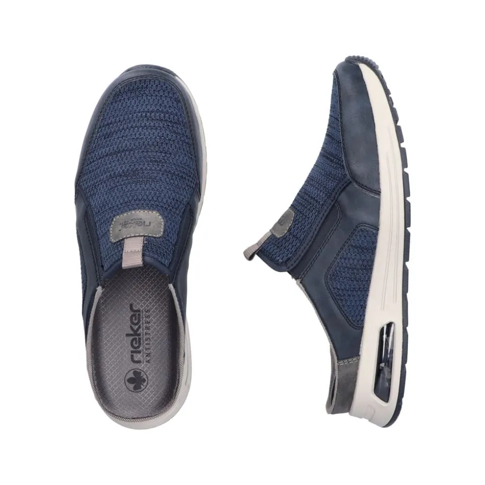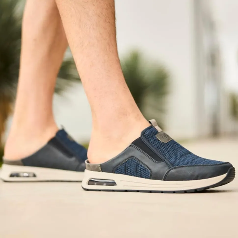 Rieker hyttesko til herre i blå. Funktionel og stilfuld. Denne blå Rieker-hyttesko til mænd med elastisk indlæg gør på- og aftagning af sandalen hurtig og nem. Med den lette, stødabsorberende sål og den polstrede, udtagelige indersål får du den bedste komfort hele dagen. Den komfortvidde G giver ekstra plads til bredere fødder, mens Rieker Air i hælen tilføjer både et moderne look og en blød stødabsorbering.