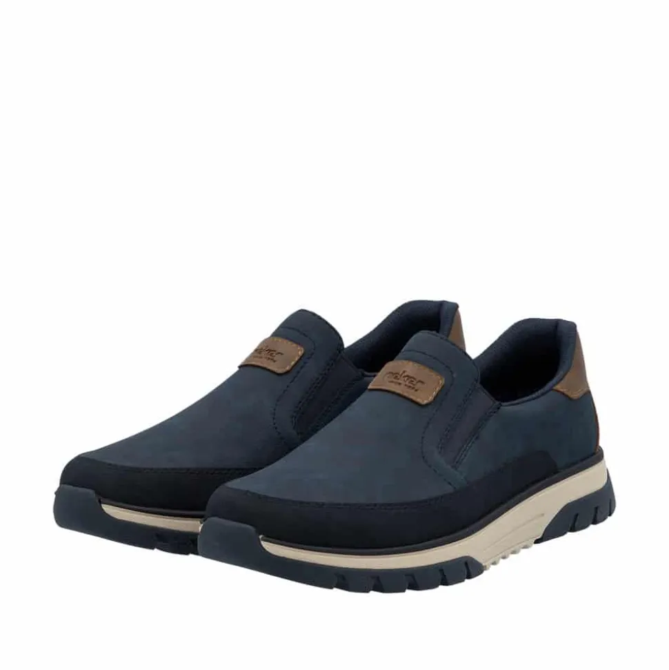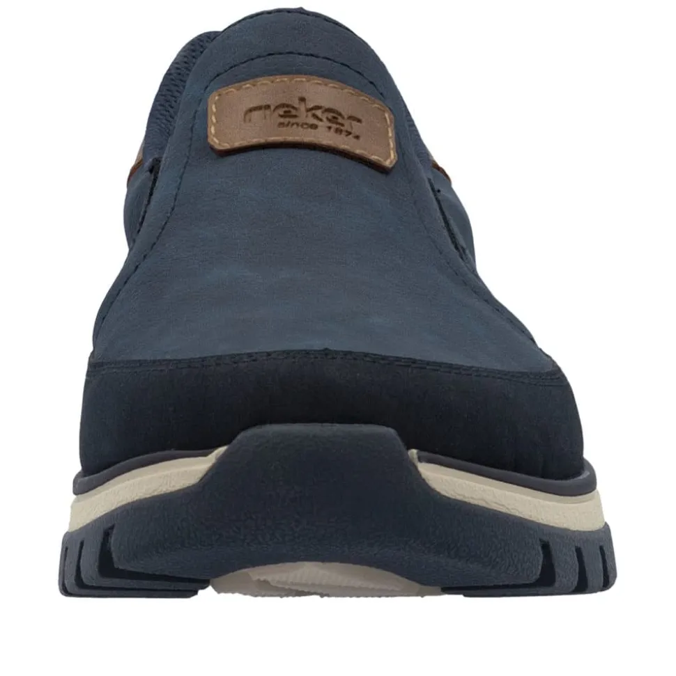 Rieker hyttesko til herre i blå. Disse blå Rieker hyttesko kombinerer stil og komfort i ét design. Skoene har elastik ved åbningen, som gør dem lette at tage af og på og giver en god pasform omkring foden. Med Rieker Antistress føles skoene både lette og fleksible, selv efter mange timers brug. Indvendigt finder du en blød og udtagelig sål, som sikrer god komfort hele dagen. Den ekstra bredde (H) giver god plads og bevægelsesfrihed, mens den mønstrede ydersål øger både stødabsorbering og skridsikkerhed.