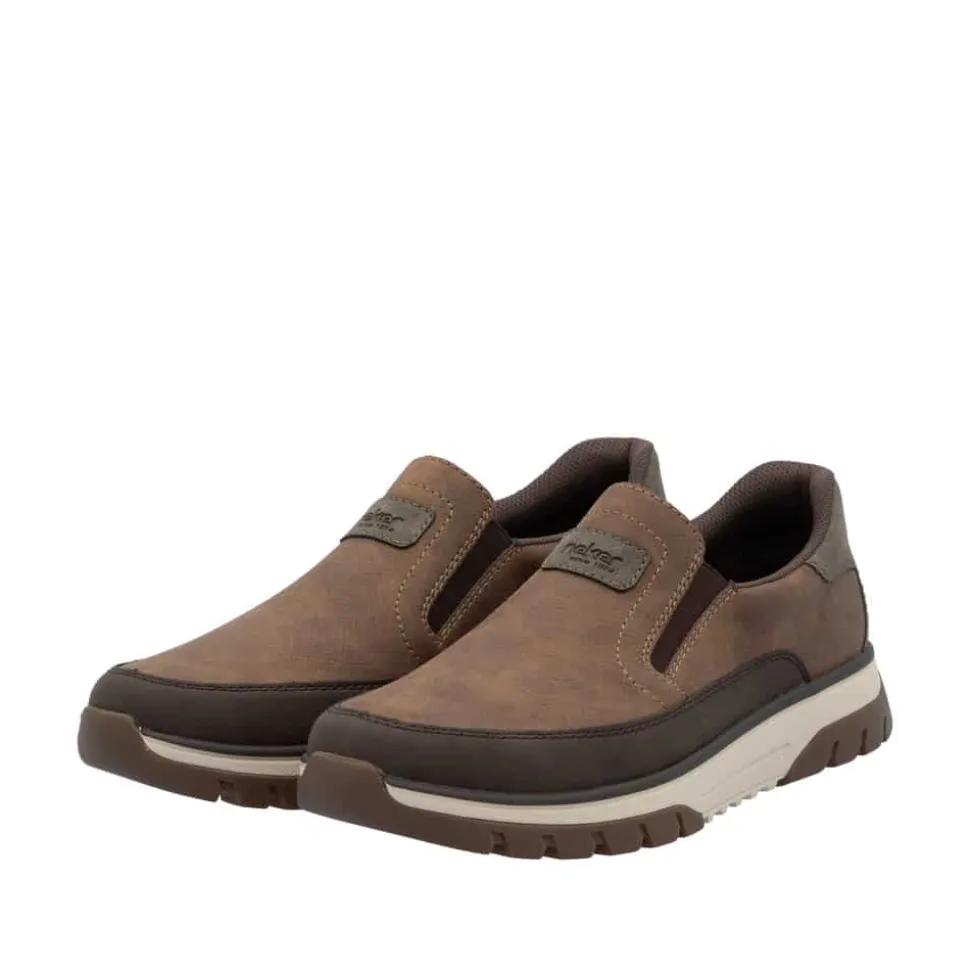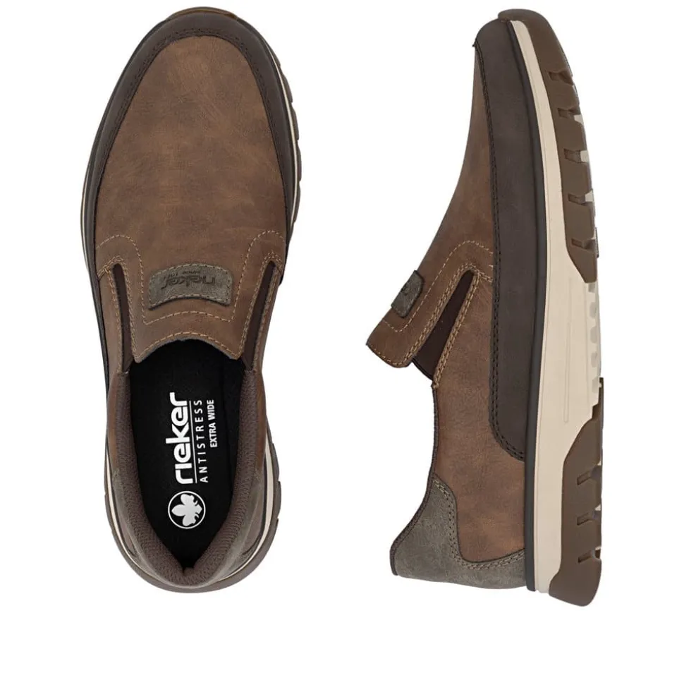Rieker hyttesko til herre i brun. En klassisk brun Rieker sko med fokus på komfort og funktion. Elastikken omkring åbningen giver en fleksibel pasform og gør det nemt at tage skoen på. Indvendigt sikrer den udtagelige Rieker soft sål god komfort hele dagen, og den ekstra bredde (H) giver mere plads til foden. Takket være Rieker Antistress er skoen både let og fleksibel. Ydersålen er designet med mønster, der øger stødabsorbering og skridsikkerhed.