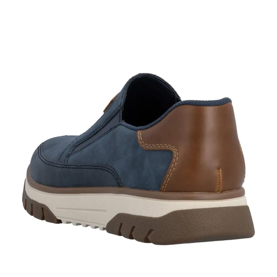 Rieker hyttesko herre i blå. Stilfulde og komfortable sko i et praktisk design, hvor pasform og komfort er i fokus. Elastikken ved åbningen gør at du nemt kan komme i skoen. Indvendigt finder du en blød udtagelig indersål, som giver behagelig komfort hele dagen. Med ekstra bredde (H) får du god rummelighed til foden, så skoen føles behagelig at bruge. Den mønstrede ydersål giver øget støtte og skridsikkerhed.
