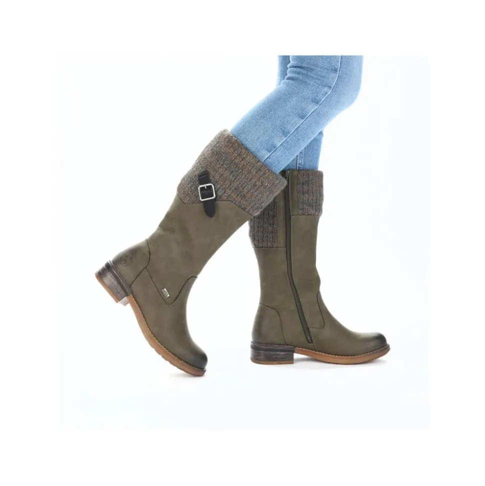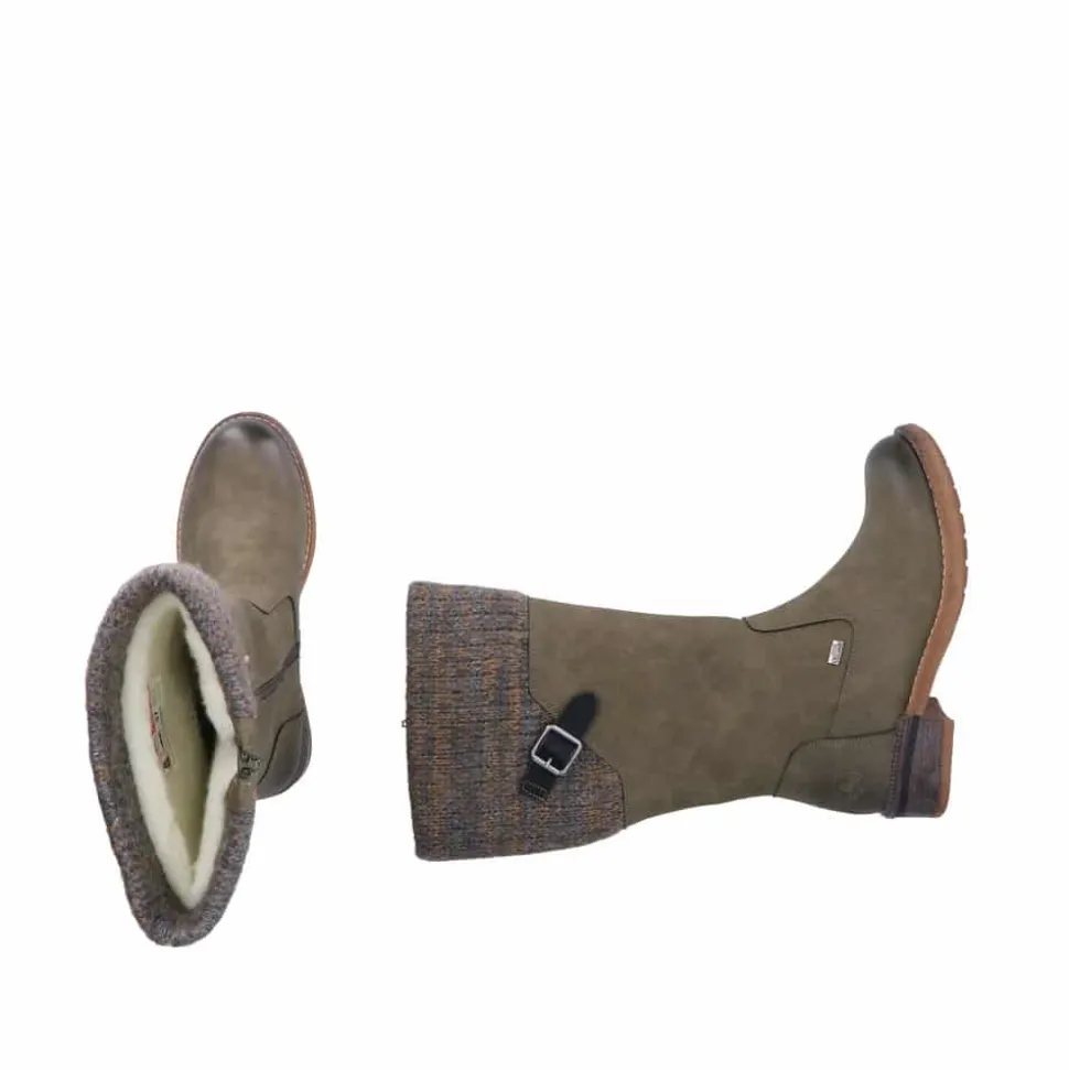 Rieker lang støvle til dame i grøn. Smart vinterstøvle i en moderne grøn farve med flotte detaljer, der giver et stilfuldt udtryk. Støvlen har en strikket krave og en spænde, som tilfører et moderne touch, mens lynlåsen på indersiden gør den nem at tage af og på. Indvendigt finder du en varm foring, der holder fødderne lune, og en blød indersål, som giver komfort hele dagen. Takket være Rieker-Tex er støvlen kraftigt vandafvisende, og den stødabsorberende ydersål med mønster giver god støtte og øget skridsikkerhed.
