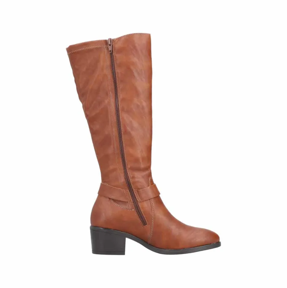 Rieker lang støvle til dame i brun. Smuk brun støvle med langt skaft og en flot detalje på siden, der giver et stilfuldt udtryk. Støvlen har en funktionel lynlås på indersiden, så den er nem at tage af og på. Indvendigt sørger en let foring for at holde fødderne lune, mens den bløde indersål giver ekstra komfort. Den elegante blokhæl på cirka 5,5 cm løfter looket, uden at det går ud over komforten. Ydersålen har stødabsorberende egenskaber, som giver god støtte hele dagen.
